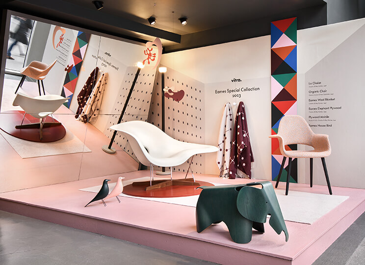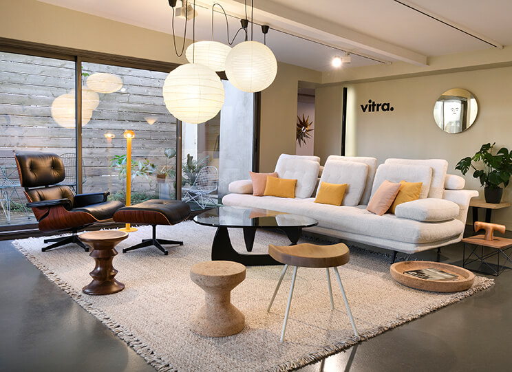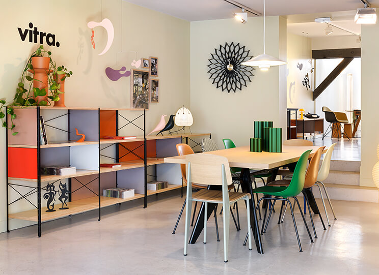 highlighted by the graphic play of walls painted in different colors. On the 1st floor, in addition to the multi-brand offer, two areas are dedicated to brands: one to Vitra and the other to the outdoor brand Dedon.