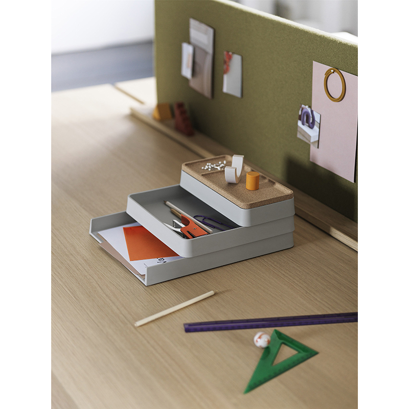 Arrange Desktop apporte une perspective nouvelle et durable aux accessoires de rangement modernes. Cette série totalement modulable est composée de plateaux en plastique 100% recyclé et recyclable, qui s’accompagnent d’un couvercle en liège ou en aluminium anodisé. Avec ses plateaux disponibles en trois dimensions et plusieurs couleurs et ses deux différents couvercles, la collection