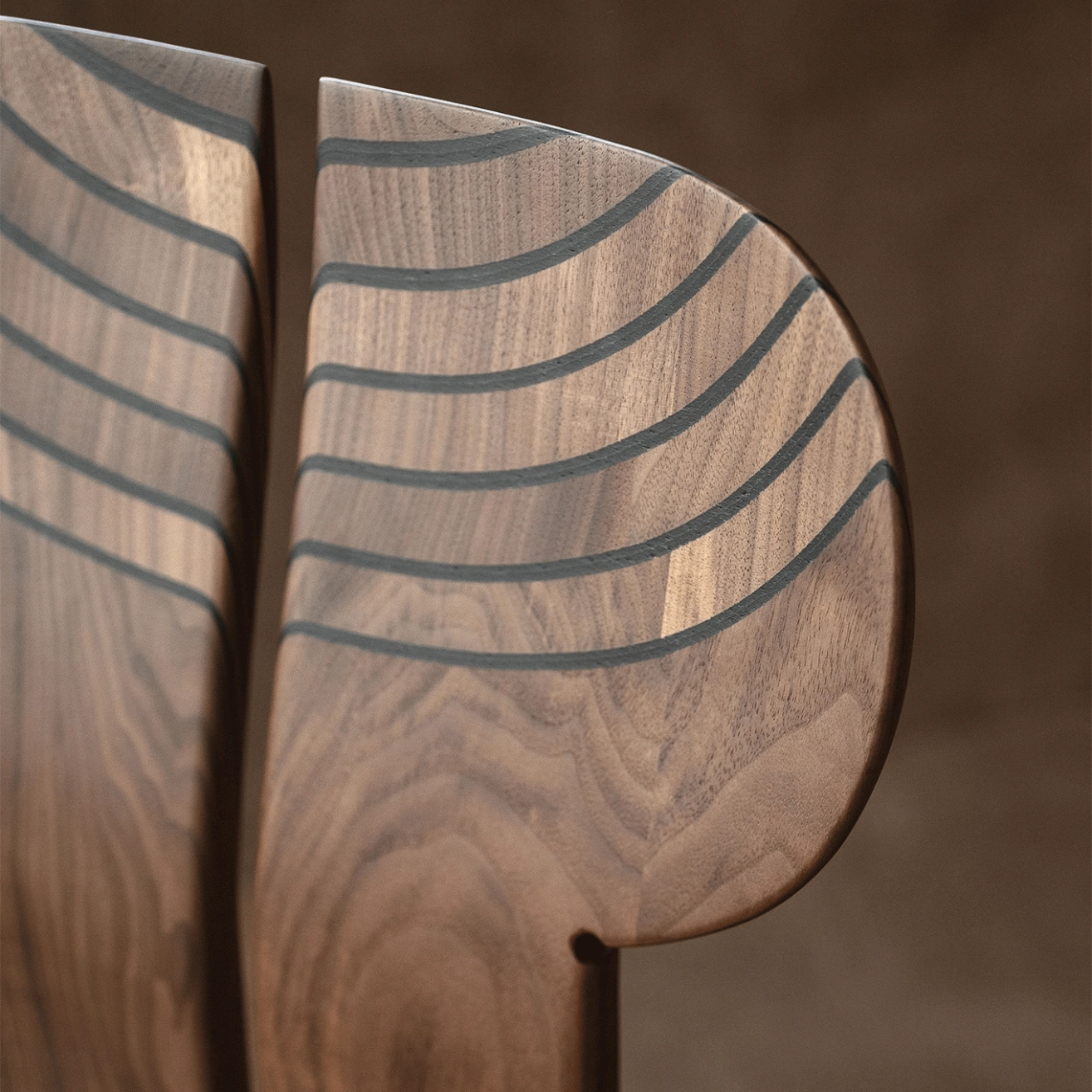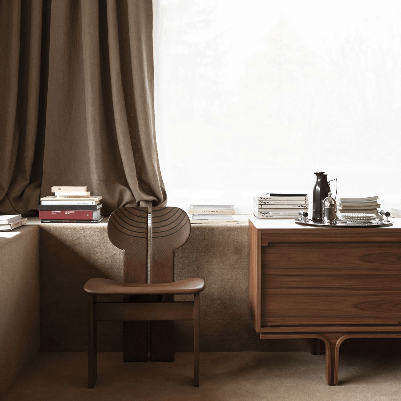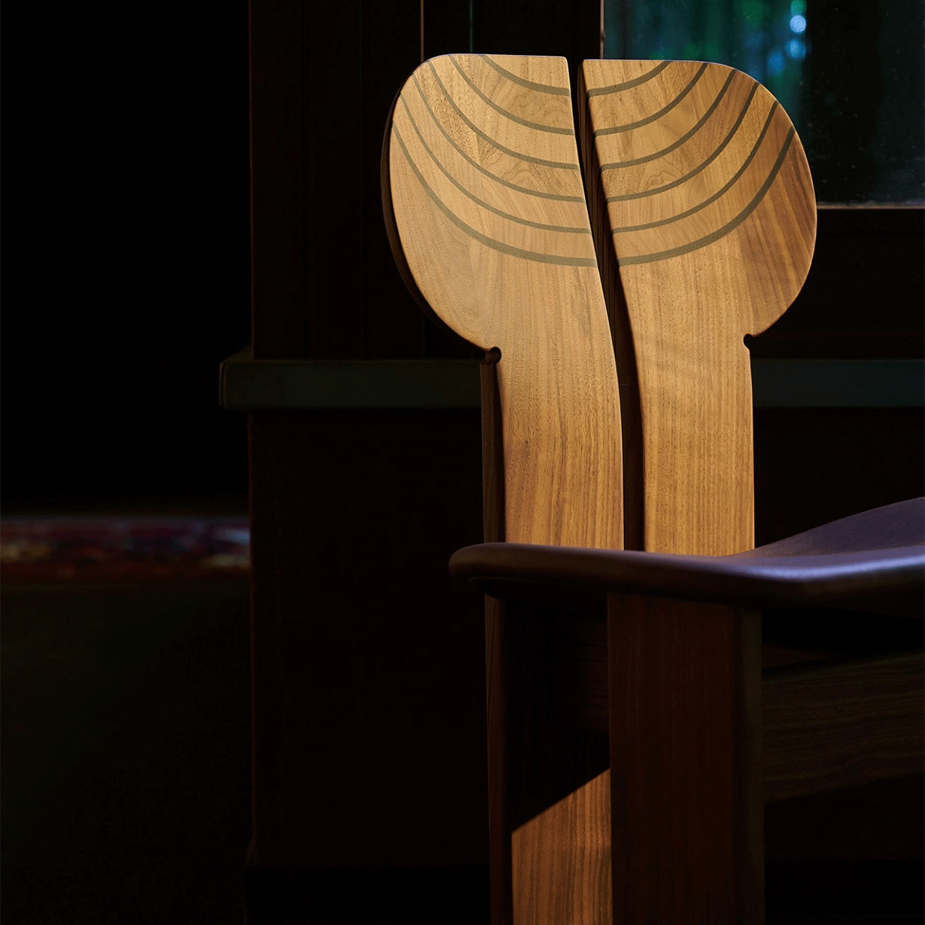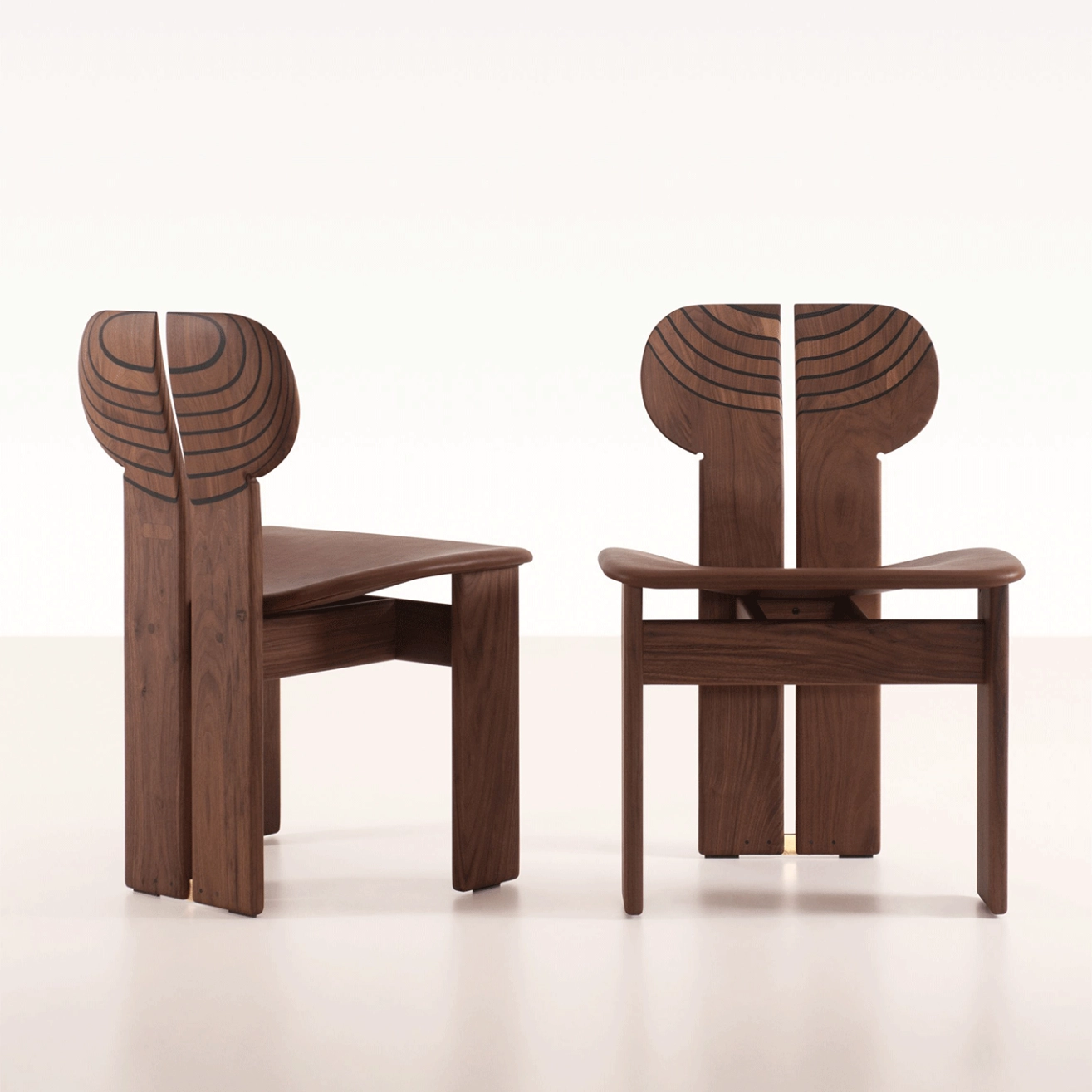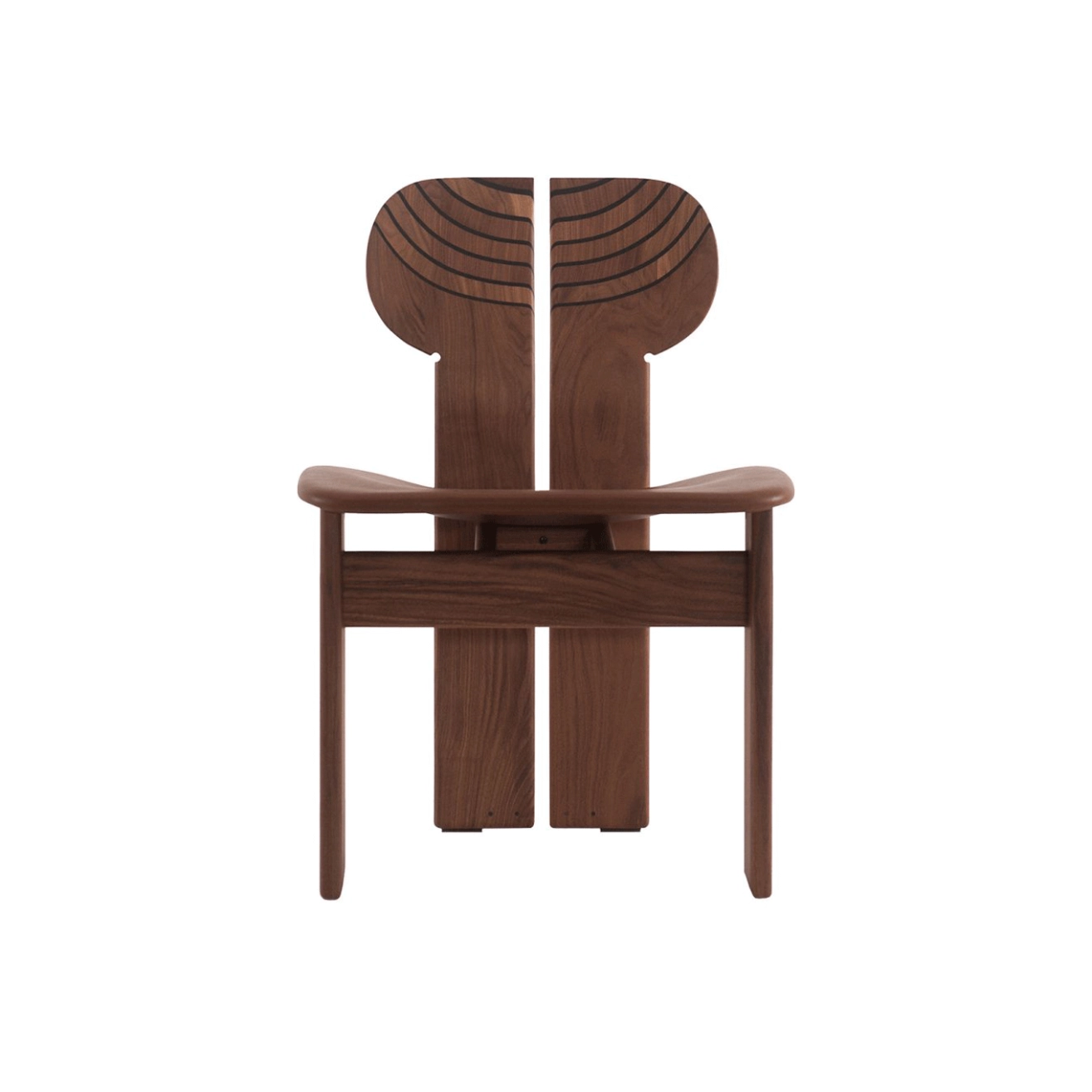 Tacchini, ne se contente pas d’accueillir : elle raconte une histoire. Sculptée dans le bois avec une précision remarquable, chaque détail, du placage de noyer canaletto au dossier façonné à la main, joue subtilement avec la lumière et révèle les veines naturelles du bois. L’espace entre le dossier et les pieds arrière élève l’assise en une silhouette totemique, hommage à l’art ancien de l’ébénisterie. Africa s’affirme ainsi comme une pièce sculpturale où structure, forme et émotion se répondent.