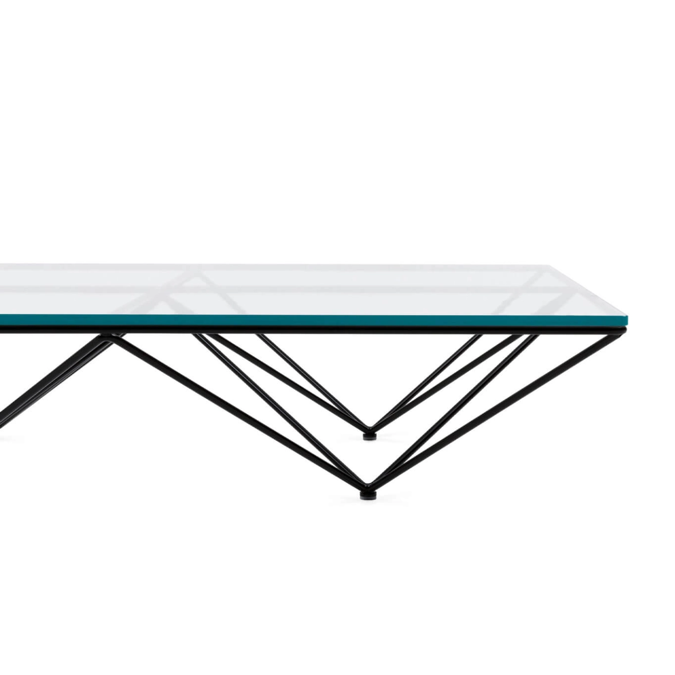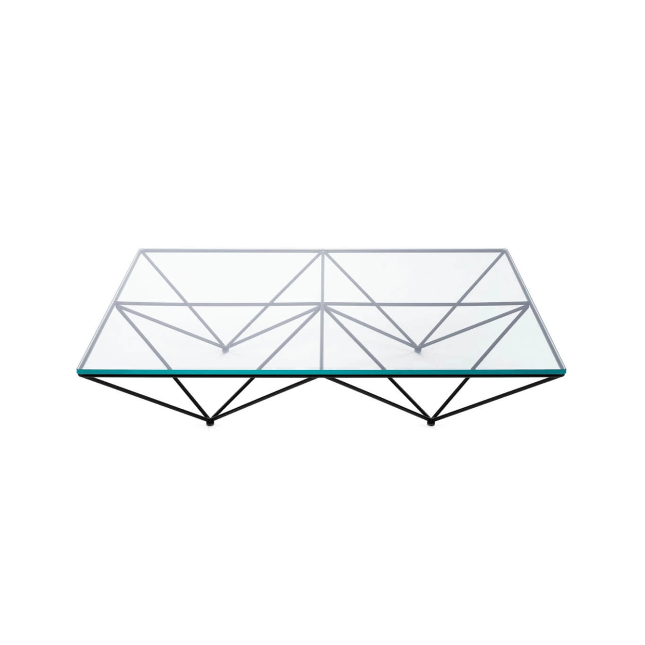 B&B Italia, cette table reste un exemple incontournable de mobilier contemporain et élégant. Le design de la table repose sur une base géométrique distinctive, évoquant des pyramides renversées, une structure géodésique qui confère à l'ensemble une légèreté surprenante malgré sa forte présence visuelle. Le plateau en