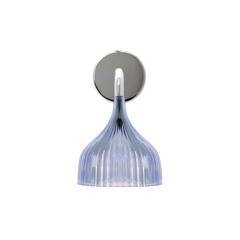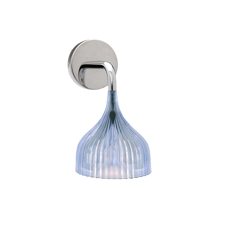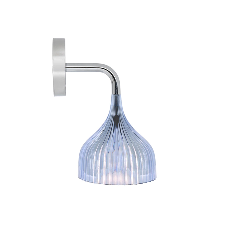 L'applique murale E' a été conçue par Ferruccio Laviani pour la marque Kartell. E' est une applique au design simple et essentiel, composée d'un diffuseur en forme de rosace plissée, fixé sur un support en métal chromé. L'applique E' se décline dans de nombreuses couleurs transparentes (cristal, rose, bleu ciel, jaune, vert) ou opaques (noir et blanc).