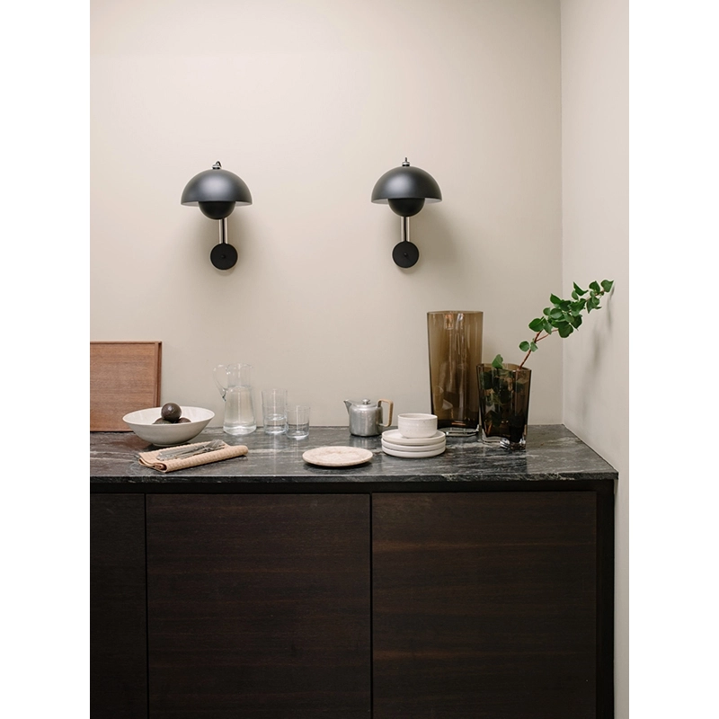 En 1968 la révolte des étudiants à Paris, à Rome et aux Etats-Unis renversaient les vieilles valeurs trop sévères et engageaient la génération « Flower-Power » faite de paix, d'amour et d'harmonie. La même année, Stanley Kubrick imaginait le futur, l'an 2001, mettant en vedette la chaise Panton devenue un classique du design, et l'homme était sur le point de poser le pied sur la lune. Dans le monde du design, une suspension colorée et ludique fleurissait dans les restaurants, les expositions et bientôt dans nos maisons. La lampe FlowerPot, avec ses deux demi sphères face à face, présente un design intemporel et de qualité, édité par & Tradition. L'applique Flowerpot VP8 peut être installée sur une prise électrique, grâce à son câble fourni, mais peut être aussi raccordée à une sortie électrique au mur.