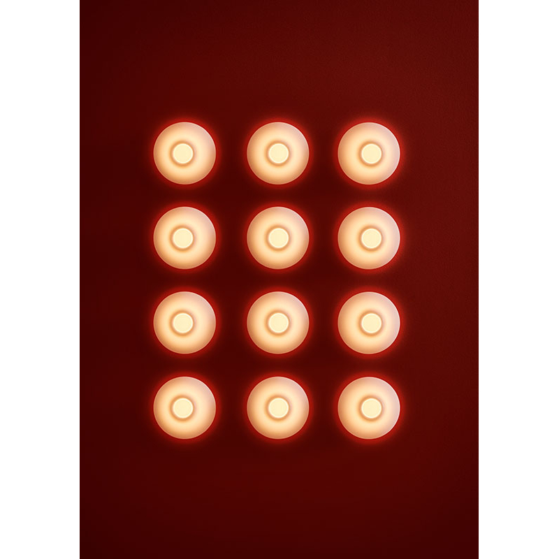 applique se distingue par ses lignes symétriques et graphiques qui apportent une touche contemporaine aux intérieurs. La source lumineuse, placée au centre et entourée d'un abat-jour conique, crée un effet de halo qui diffuse une lumière chaude et accueillante. Son design neutre mais affirmé permet à l’applique