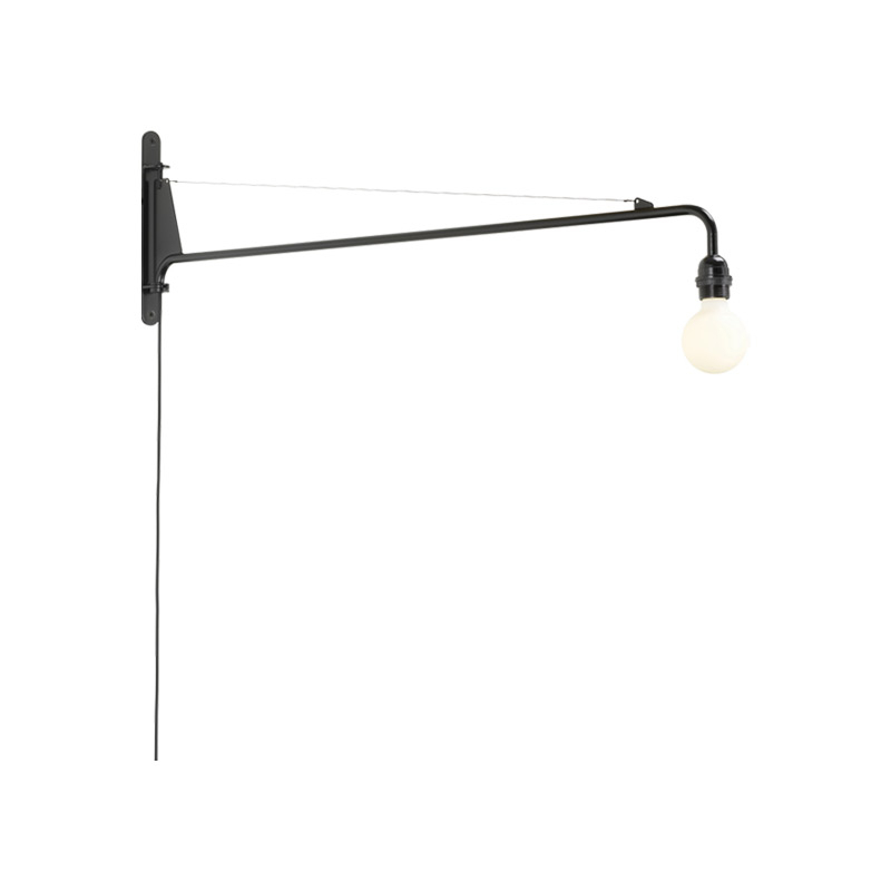 Petite Potence. Ce luminaire épuré se caractérise par son ampoule simple fixée à une longue barre pivotante en acier, maintenue par un fil d‘acier. Avec des proportions similaires au grand modèle,