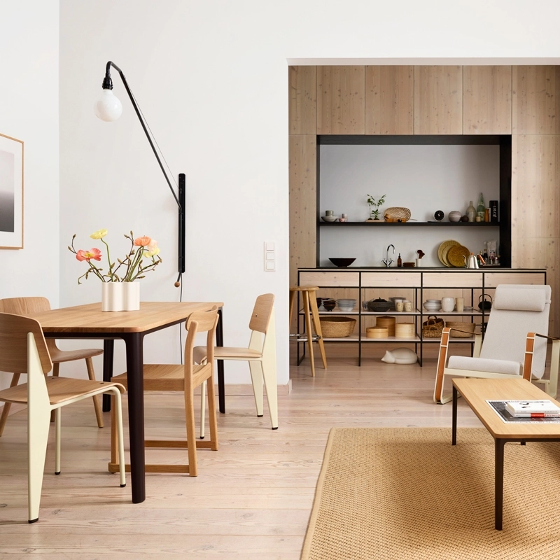 Né en 1901 à Paris, Jean Prouvé est apprenti orfèvre chez Emile Robert à Enghien et Szabo à Paris, avant de poursuivre ses études à l’école supérieure de Nancy. Dès 1923, il s’affirme comme constructeur-concepteur au travers une œuvre architecturale et mobilière prônant une esthétique de la nécessité. En 1930, Jean Prouvé est cofondateur de l’association d’artistes «Union des Artistes Modernes» (U.A.M.), en 1931 il crée «Les Ateliers Jean Prouvé». C’est là que de nombreux meubles voient le jour dans les années 30, ainsi que les premiers éléments architecturaux préfabriqués. Son mobilier universitaire Cité (1931) ou Antony (1954) gère avec ingéniosité aspects utilitaires, respect et économie du matériau et exigences de la fabrication en série. Vitra réédite depuis quelques années déjà les plus beaux spécimens de sa production de mobilier. Parmi ses plus grands classiques du design, on retrouve Antony, un fauteuil unique en son genre. Ce dernier se distingue par sa structure surprenante que Jean Prouvé a su marier à une forme d’une dynamique frappante. On peut également citer la lampe murale pivotante Potence conçue en 1950 pour la maison « Tropique » considérée à juste titre comme le chef-d’œuvre puriste du designer.