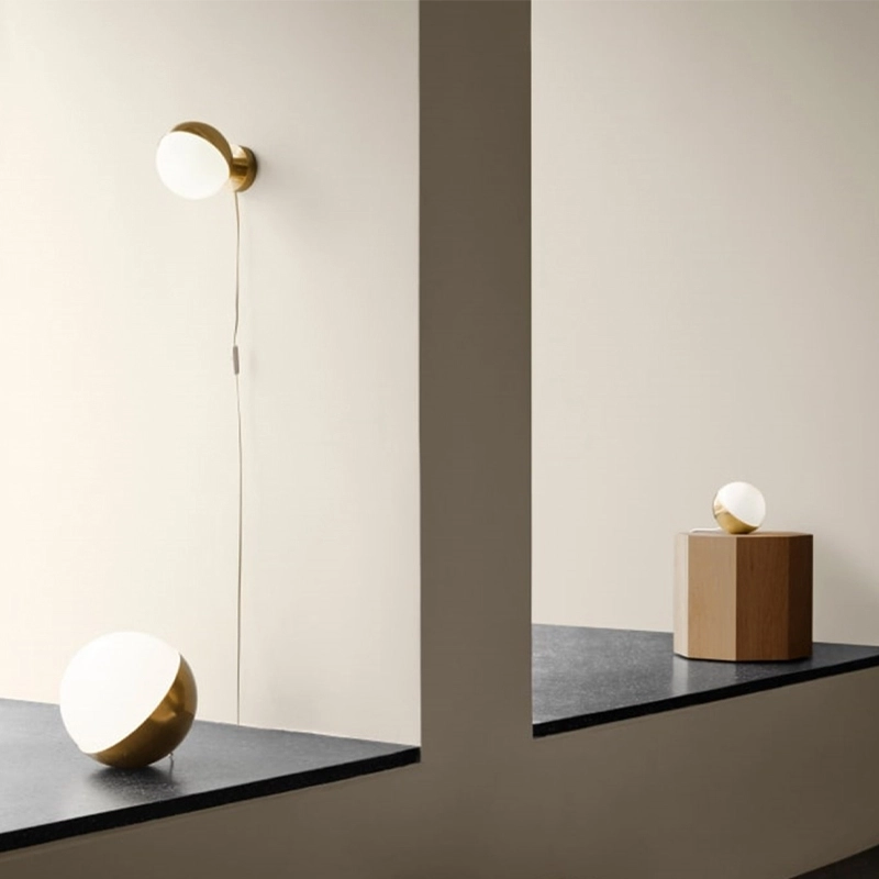 verre opalisé blanc, aluminium noir ou laiton, laiton non traité qui acquiert une patine dans le temps