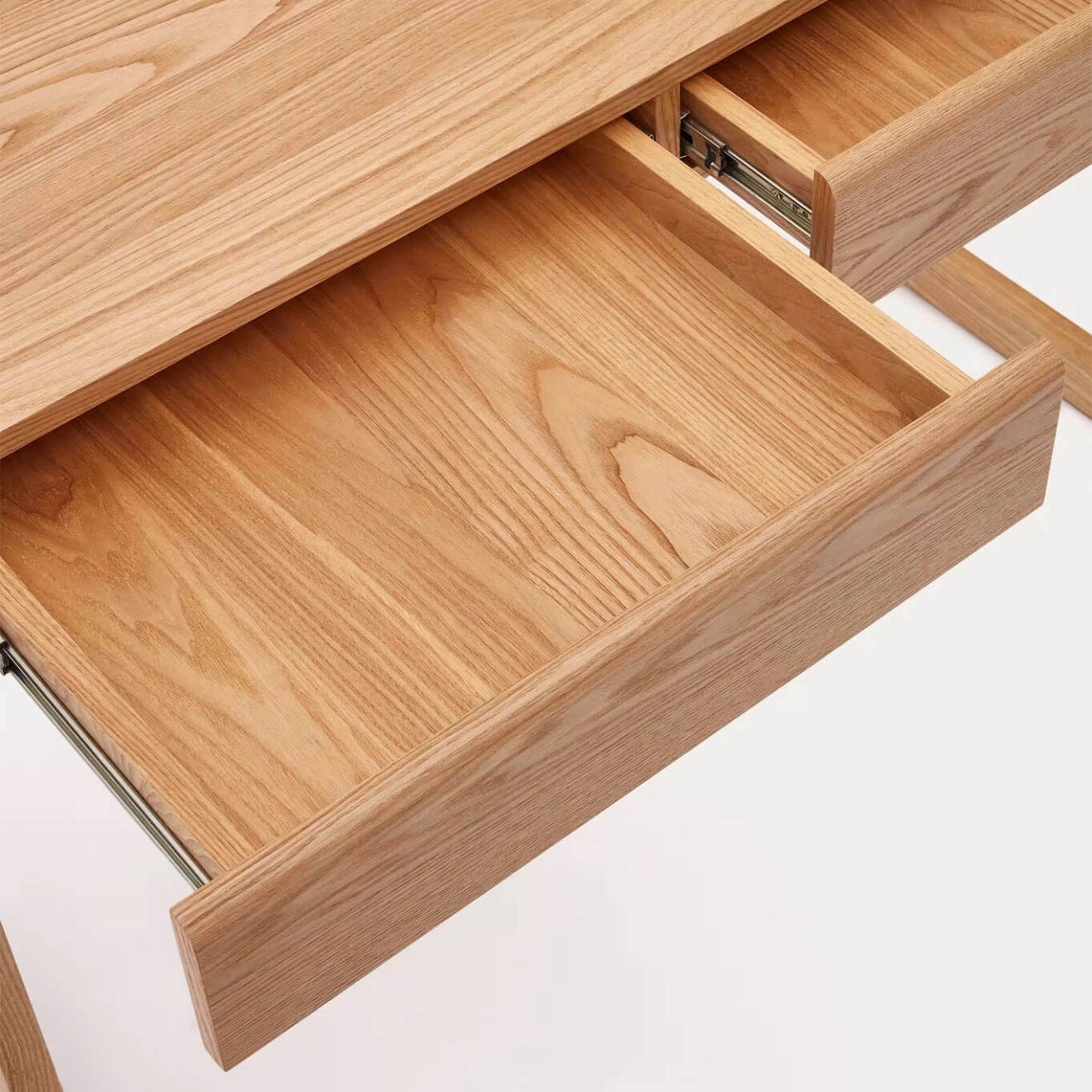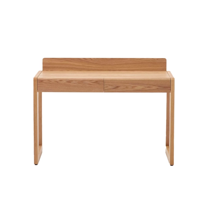 Kave Home. Ce bureau compact dispose de deux tiroirs en contreplaqué et bois de frêne, offrant à la fois fonctionnalité et élégance. Les pieds réglables permettent un ajustement parfait pour s’adapter à toutes les surfaces. Fabriqué à partir de bois durable, le bureau Arandu est idéal pour meubler votre espace de travail tout en gardant votre intérieur ordonné. Son design épuré et peu encombrant vous permet de maximiser l’espace de votre bureau tout en apportant une touche naturelle et moderne.