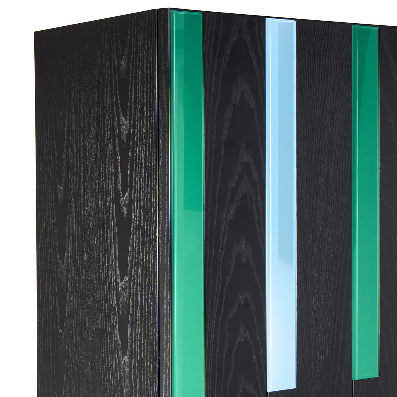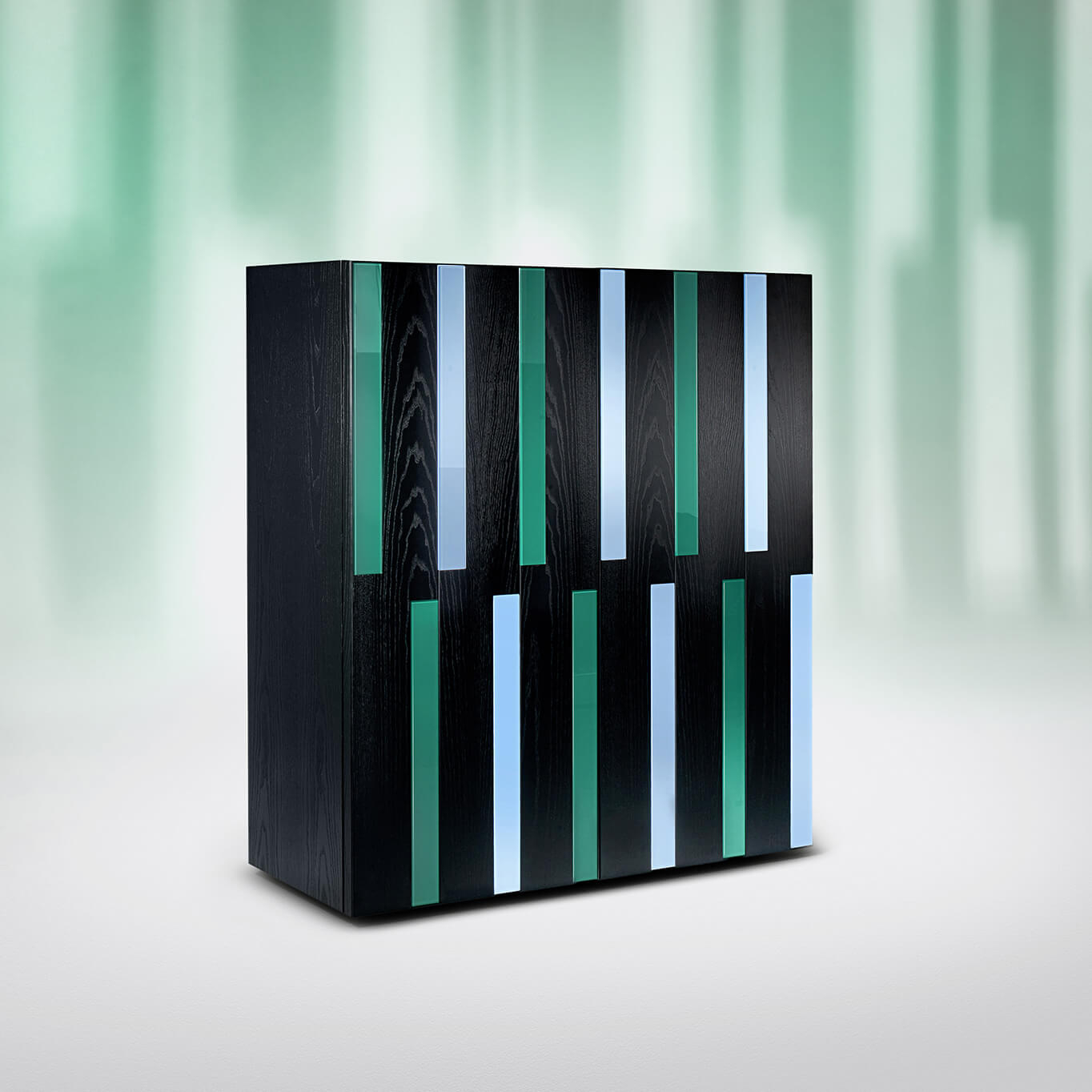 Fruit d'une collaboration avec le designer et artiste français Pierre Charpin et Zanotta, Riga-Riga est une collection comprenant des tables et des rangements sculpturaux. Le rangement Riga-Riga se distingue par un motif incrusté de verre artisanal coloré. Le contraste entre le bois de frêne et les éléments en verre coloré poli crée un rythme et un aspect tridimensionnel, positionnant la collection Riga-Riga dans un univers artistique.
