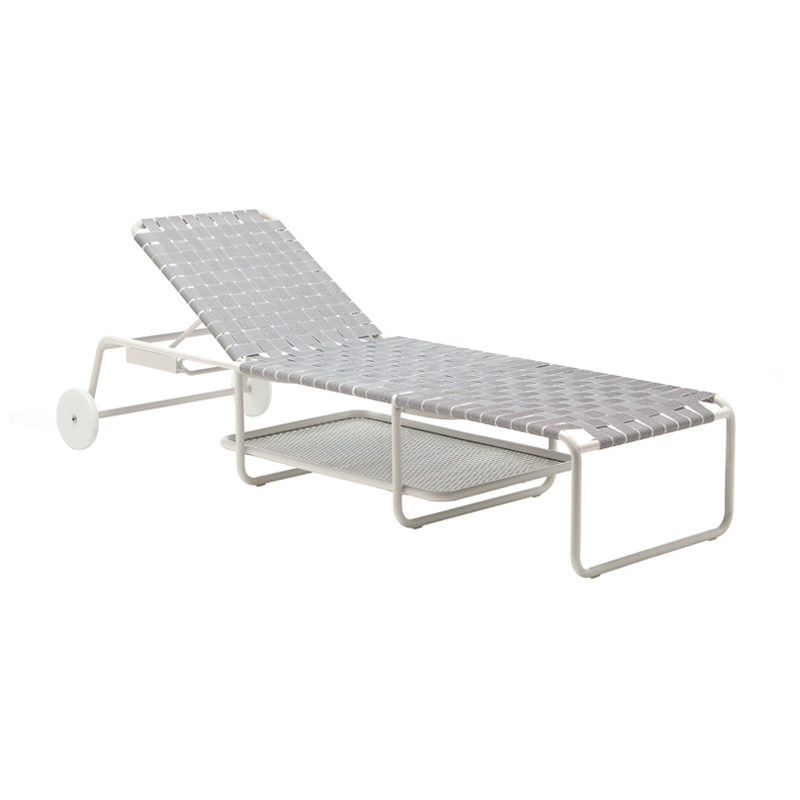 aluminium laqué, tressage sangles élastiques grises, roulettes téflon