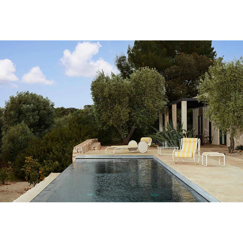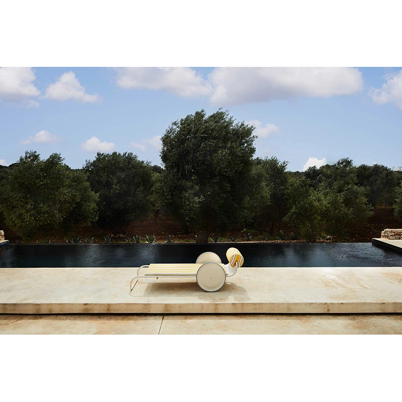 Le bain de soleil Locus Solus est une réédition inédite par Exteta et Jacquemus du modèle créé en 1964 par la designer italienne Gae Aulenti. Ce bain de soleil s'harmonise parfaitement avec les autres éléments de la collection Locus Solus et offre une élégance intemporelle à votre espace extérieur. La structure du bain de soleil Locus Solus est en acier tubulaire inoxydable poudrée en beige. Ce processus grantit à la fois durabilité et résistance aux intempéries, faisant de cette pièce un choix idéal pour les environnements extérieurs. Ce bain de soleil Locus Solus, fruit de la collaboration entre Exteta et Jacquemus, incarne l'alliance réussie entre le design intemporel de Gae Aulenti et la créativité contemporaine apportée par Simon Porte Jacquemus par la création des tissus de revêtement : beige et rayures jaunes Como. Cette réédition du bain de soleil Locus Solus offre non seulement une fonctionnalité exceptionnelle, mais aussi une esthétique colorée, vive et raffinée qui enrichira votre espace extérieur d'une touche de modernité et d'élégance.