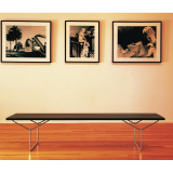lattes en bois massif laqué, piètement tiges d'acier chromé