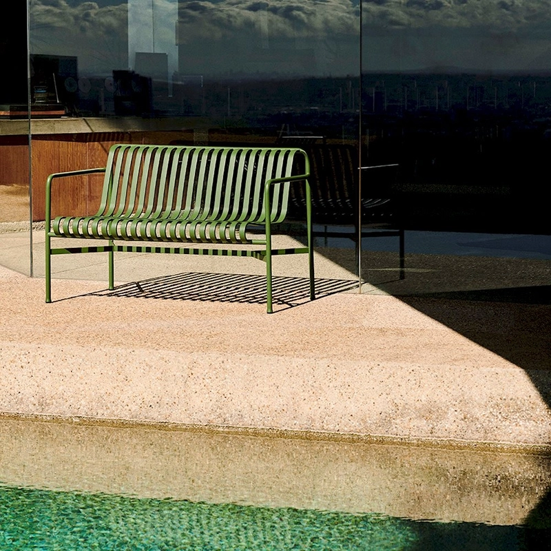 Palissade est une collection de mobilier d'extérieur dessinée par Ronan et Erwan Bouroullec pour la marque Hay. La série est composée d'une large gamme de mobilier, dans laquelle toutes les pièces partagent le même principe de conception. Palissade comprend des chaises, petits fauteuils, fauteuils lounge, tabourets, tables et bancs à l'exemple du banc avec dossier Palissade L128. Spécialement conçues pour un usage extérieur, ces pièces sont visuellement légères mais robustes dans leur réalisation. Inspirée par des meubles classiques, la collection Palissade signée Hay trouve son originalité dans les détails. Bien que conçus en acier, ces meubles outdoor sont confortables simplement grâce à leur design. Chaque pièce est disponible en vert olive, gris clair ou anthracite et s'intègre très bien dans un environnement naturel ou urbain. Avec Palissade, les frères Bouroullec ont imaginé une collection de mobilier outdoor durable qui s'associe facilement à tous les styles : un futur Classique du design !