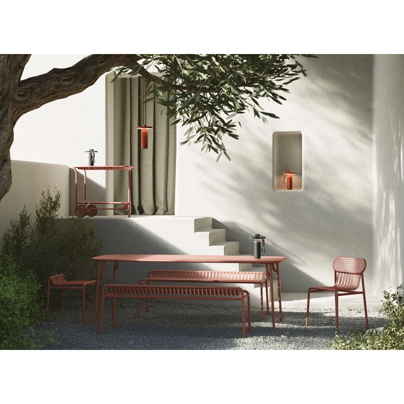 Avec Week-End, la marque française Petite Friture, pose son regard singulier sur l’été et propose avec le studio Brichet-Ziegler une approche graphique et contemporaine du mobilier de jardin. Celle-ci se joue d’un rythme de bandes horizontales et verticales posées avec habileté sur une structure aux lignes fortes. Les bandes de ce banc qui caractérisent la collection Week-End éditée par Petite Friture, sont réalisées dans des feuilles d’aluminium découpées au laser en une seule pièce et non en lattes assemblées, permettent la suppression de vis ou de soudures inconfortables. Le travail des lattes comme des rayures, souligne les pleins et les vides, affirmant l’identité de la collection. La collection Week-End est une gamme de mobilier outdoor complète. Les couleurs précises sélectionnées pour cette collection marquent seules ou en combinaison les lignes d’horizon d’un balcon, d’une terrasse ou d’un jardin. Ce banc est disponible en plusieurs couleurs comme le noir, jaune, vert jade … La mise en couleurs de la collection Week-end, de Petite Friture, en peinture poudre époxy anti-UV grainée garantit un maintien impeccable des teintes au cours du temps. Le banc design proposée par Petite Friture, a été conçu avec l’obsession de tirer le meilleur parti des matériaux et des techniques de réalisation à la disposition des designers. Réalisée en aluminium, matériau sélectionné pour sa légèreté et sa résistance aux intempéries, la collection Week-End allie confort esthétique et sens pratique. En effet, cette collection est résolument pensée autour d’une utilisation pratique car toutes les assises sont empilables.