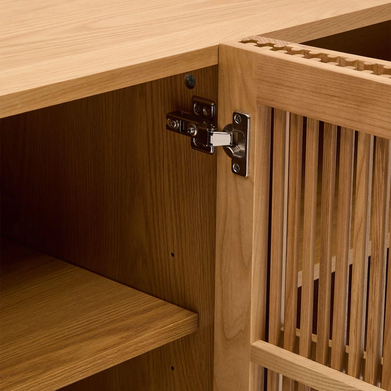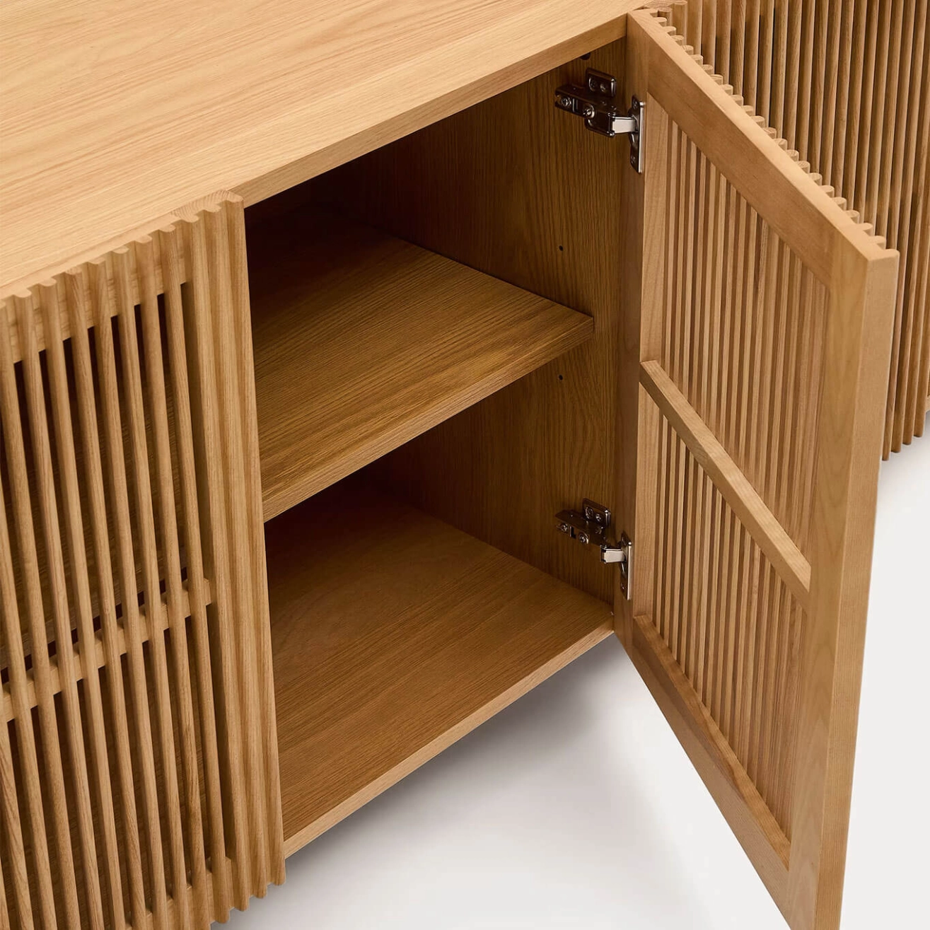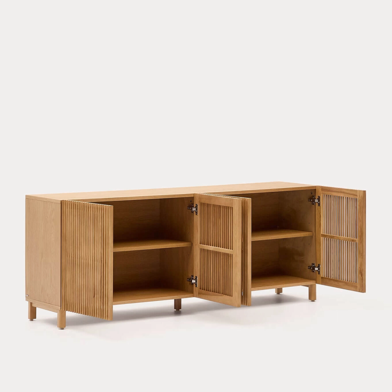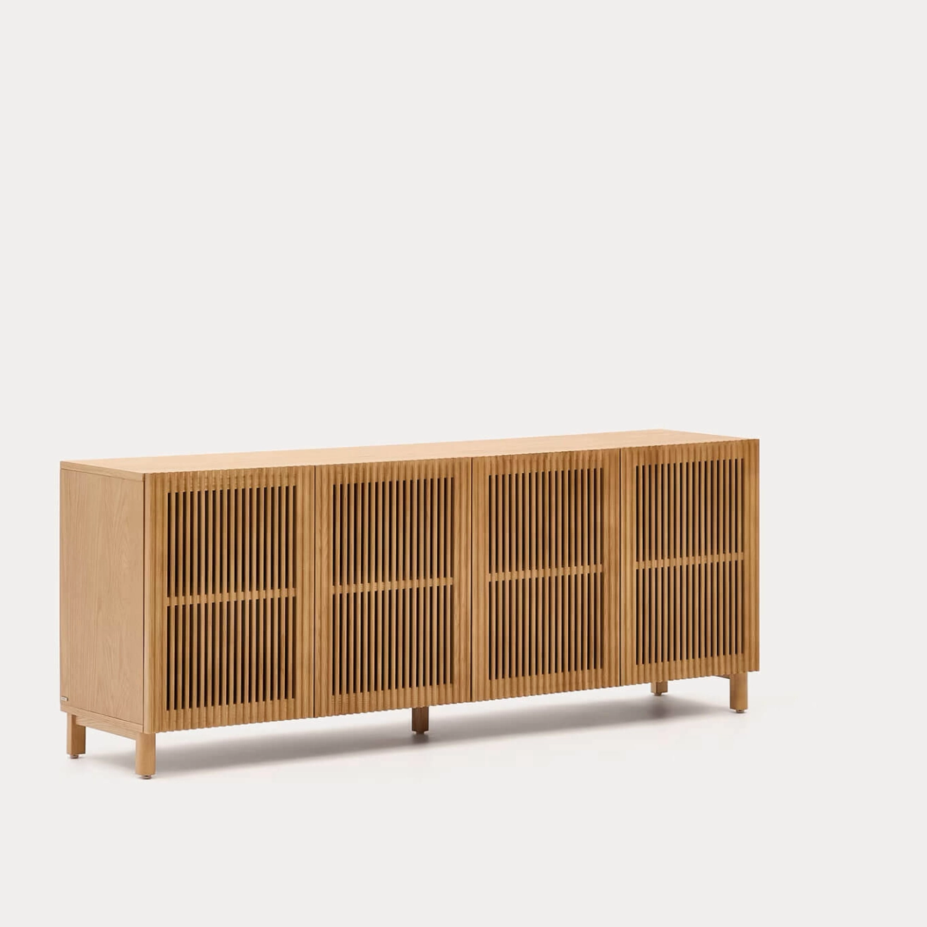 buffet possède un corps en placage de frêne ainsi que des portes et pieds en bois massif de frêne. Les portes battantes à charnières sont équipées d’une fermeture amortie et l’intérieur propose des étagères réglables en hauteur pour s’adapter à tous vos besoins de rangement. Les pieds sont ajustables afin de compenser les irrégularités du sol et garantir une stabilité parfaite. Tout le bois utilisé est certifié FSC™ 100 %, témoignant d’un engagement en faveur d’une gestion responsable des forêts. Alliant fonctionnalité, design et chaleur naturelle, le