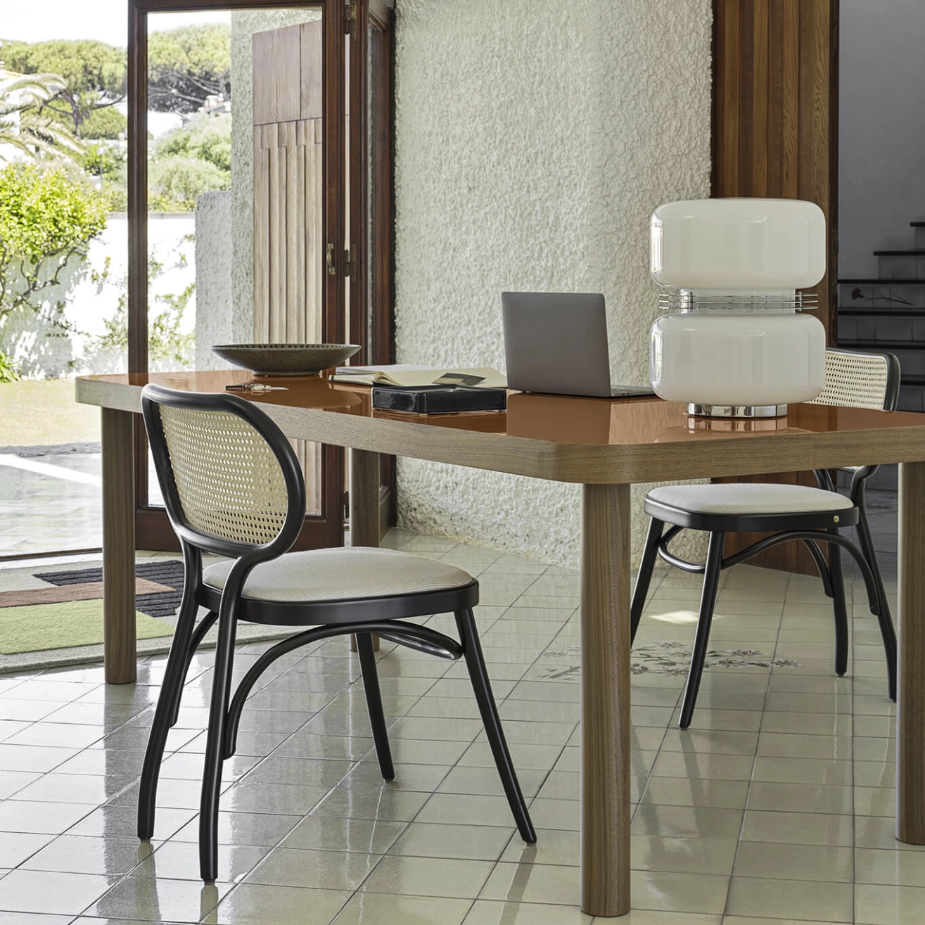 Hêtre cintré laqué, assise rembourrée, revêtement tissu Fuse, dossier en paille de Vienne