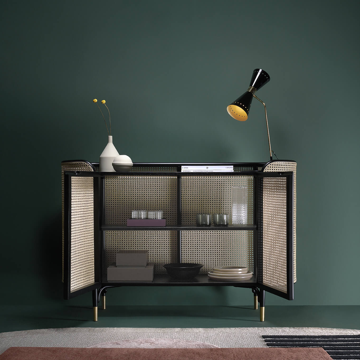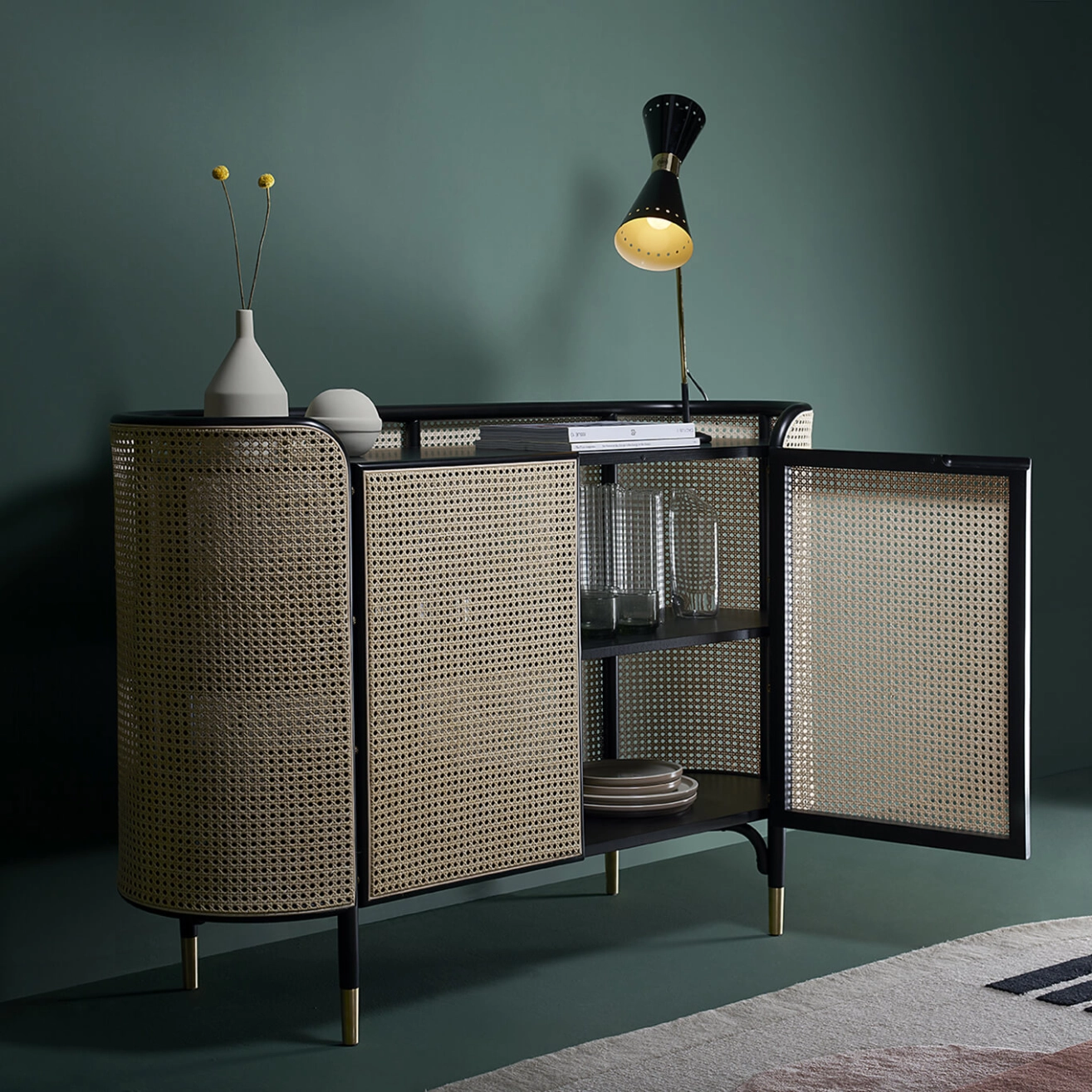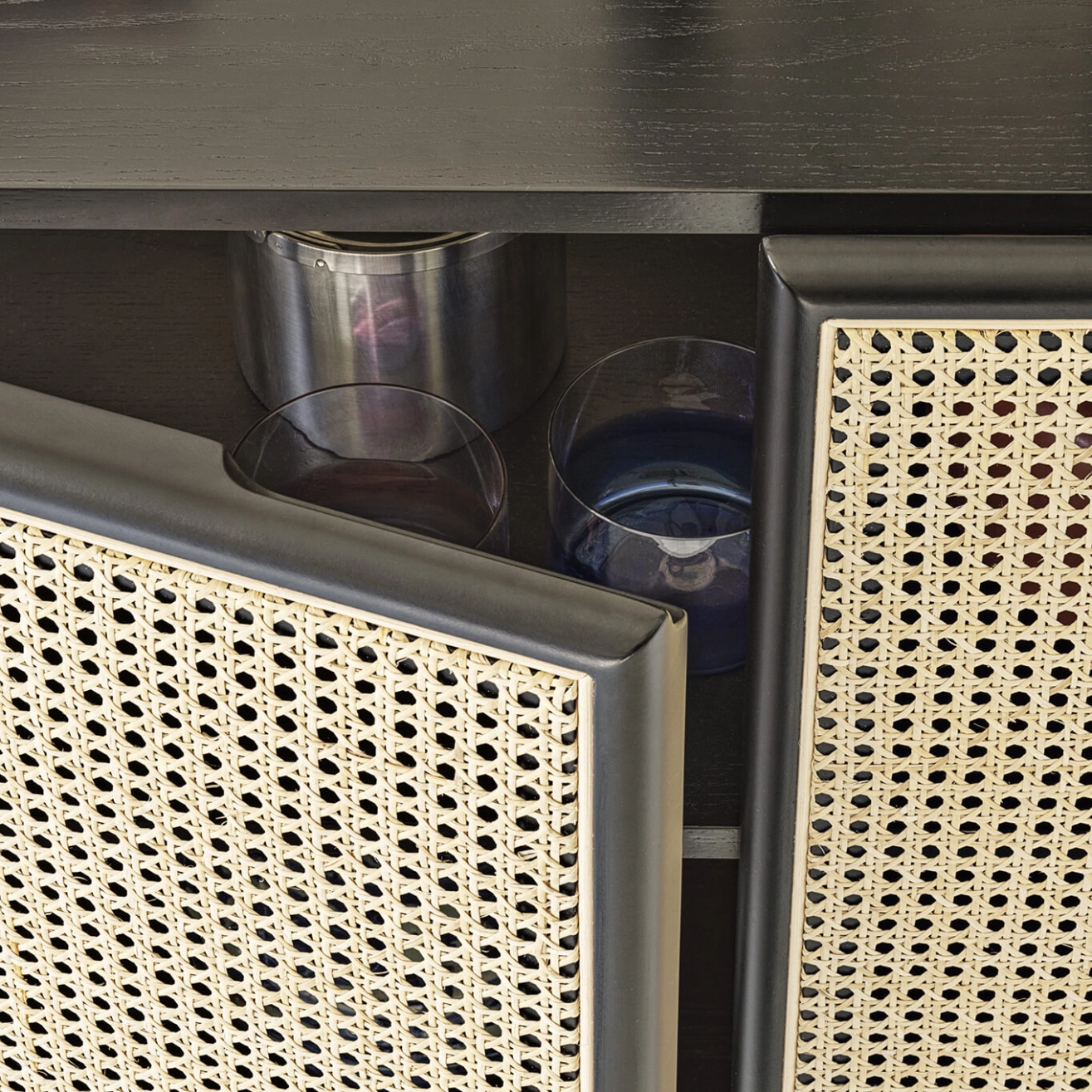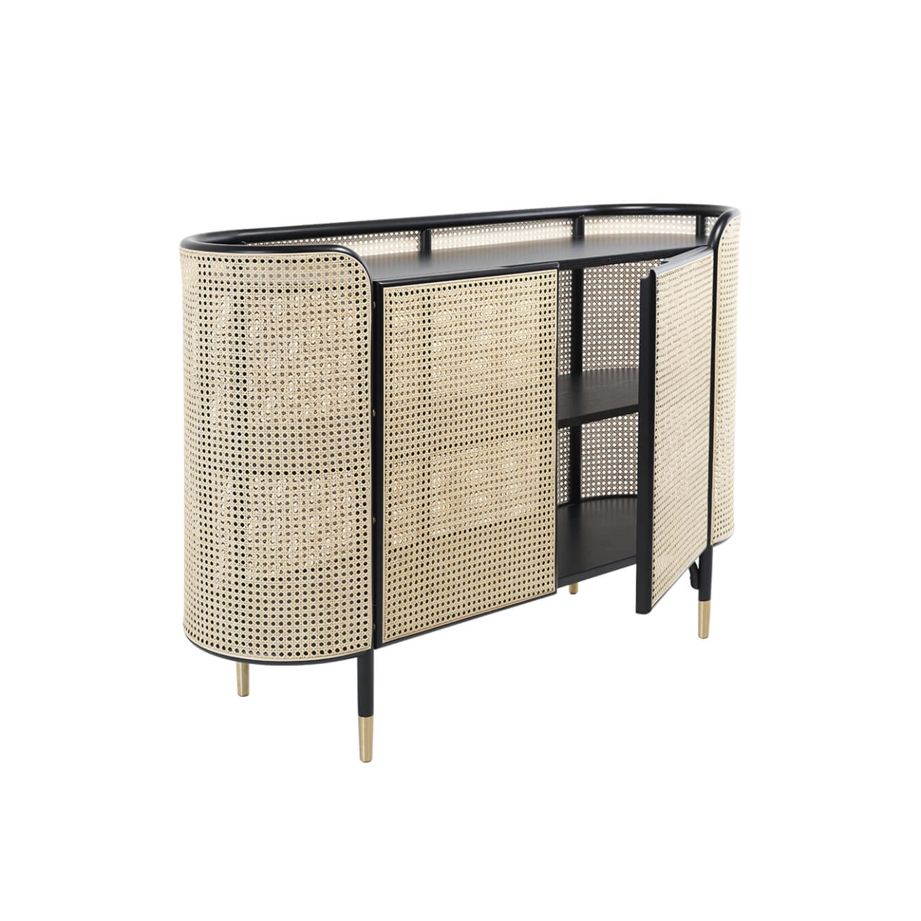 Hêtre cintré laqué, inserts latéraux en paille de Vienne, étagères en plaqué frêne teinté à pores ouverts, pieds laiton