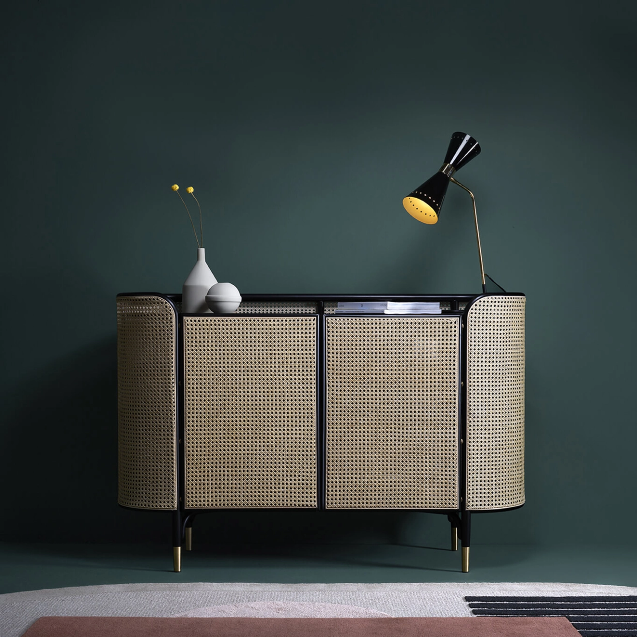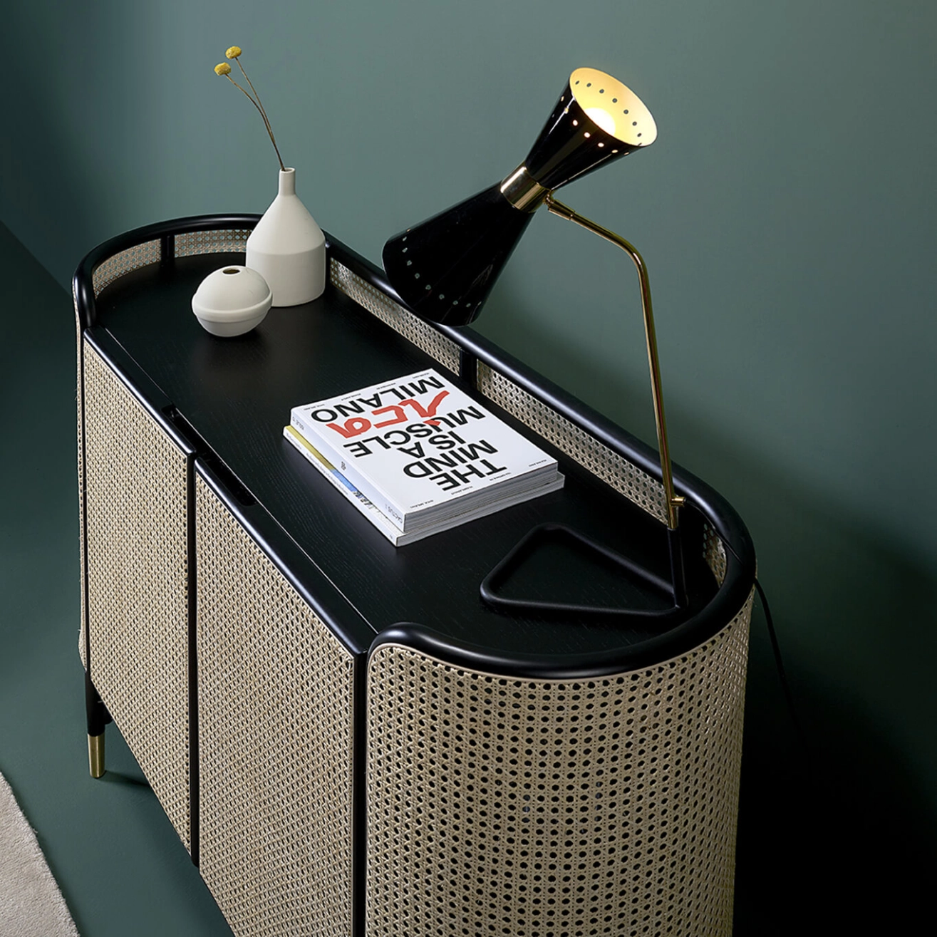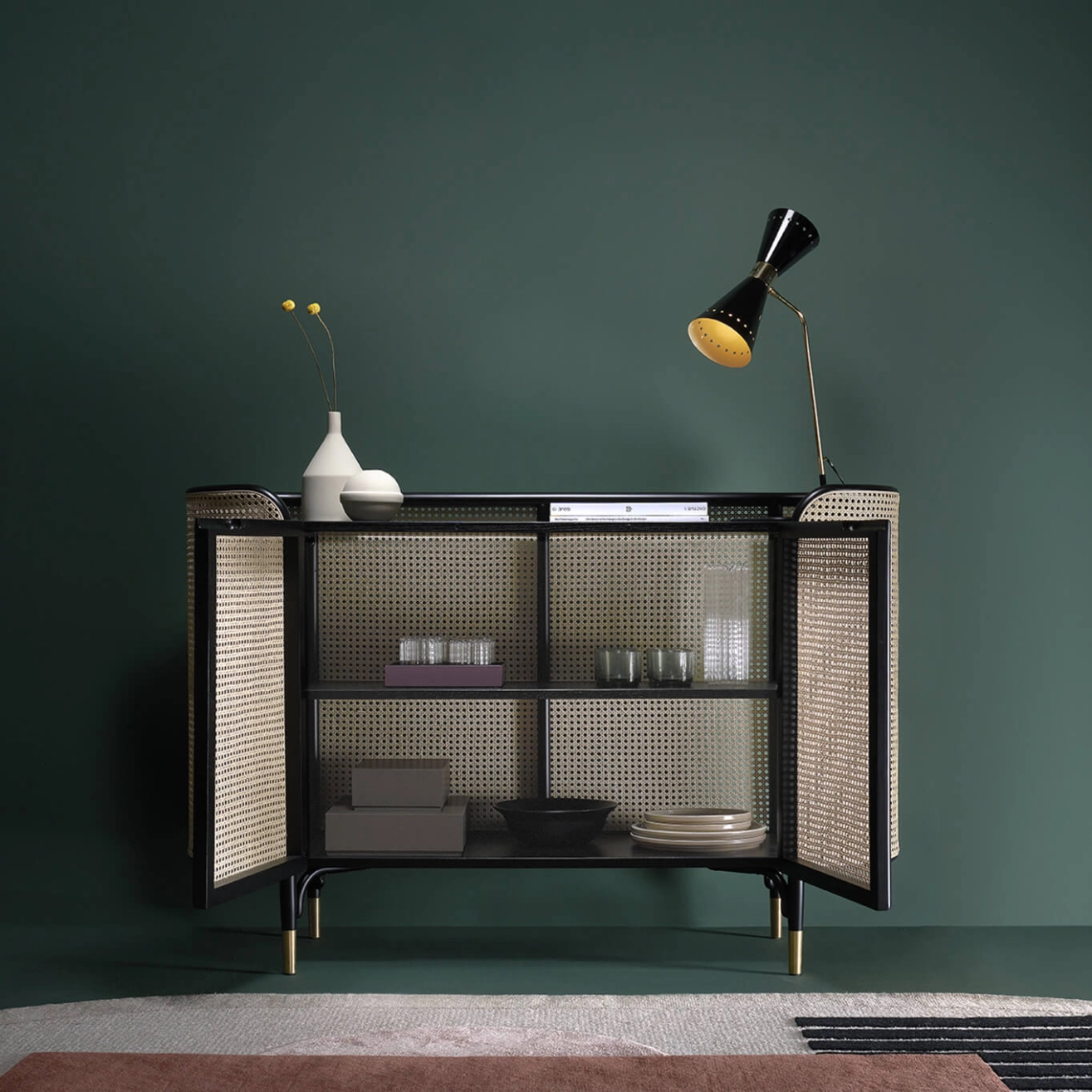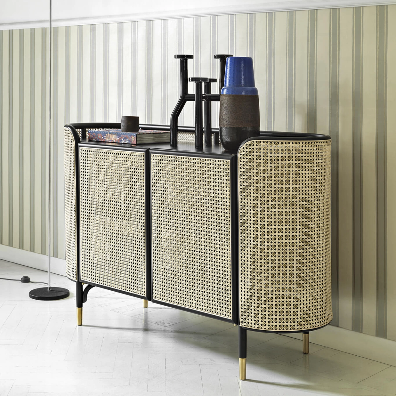 Dessinée par GamFratesi pour Gebrüder Thonet Vienna, Mos est une collection de meubles de rangement qui se distingue par des formes elliptiques et des associations de matériaux élégants. Les rangements Mos GTV s'intègrent dans tous les types d’espaces grâce à leur expression raffinée, que ce soit dans le salon, la chambre ou l’entrée. Visuellement léger, le rangement Mos est doté d’une coque en rotin tressé et de plateau en bois laqué. Le cadre en hêtre courbé teinté laqué est soutenu par des pieds en laiton.