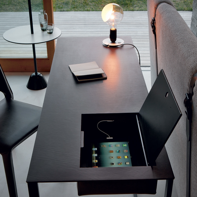 La collection 2013 de Zanotta inclut un bureau dessiné par le jeune designer Gabriele Rosa. Calamo est un petit bureau élégant peu profond, permettant de créer un espace de travail dans un petit espace de vie. C'est à la fois une table d'écriture et une console qui s'intègre dans tous les salons, contre un mur ou derrière un canapé. La structure et le plateau sont réalisés en acier verni. Un cuir sellier recouvre entièrement le plateau et forme le porte-objet. L'élément de rangement est accessible par une ouverture à bascule découpée directement dans le plateau.