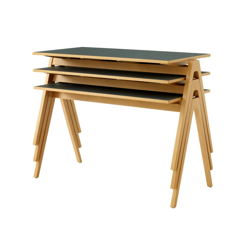 Conçu dans le cadre de la première collection de meubles bon marché de Day pour Hille en 1951, le bureau Daystak s'associe parfaitement à la chaise de la même collection, présentant les mêmes pieds en forme de A. Le bureau Daystack est disponible avec ou sans tiroirs. Ces derniers peuvent être fixés d'un côté ou de l'autre du bureau au moment de l’installation. Le bureau Daystak And Tradition est disponible en hêtre massif, avec ou sans plateau stratifié Fenix Nano dans la teinte Verde Comodoro.  Soucieuse de préserver l'essence de la collection, la marque And Tradition a collaboré avec la Fondation Robin et Lucienne Day pour s'assurer que toutes les pièces rééditées restent aussi fidèles que possible au design original, en y apportant seulement quelques ajustements mineurs pour répondre aux besoins et aux considérations d'impact des utilisateurs du 21e siècle.