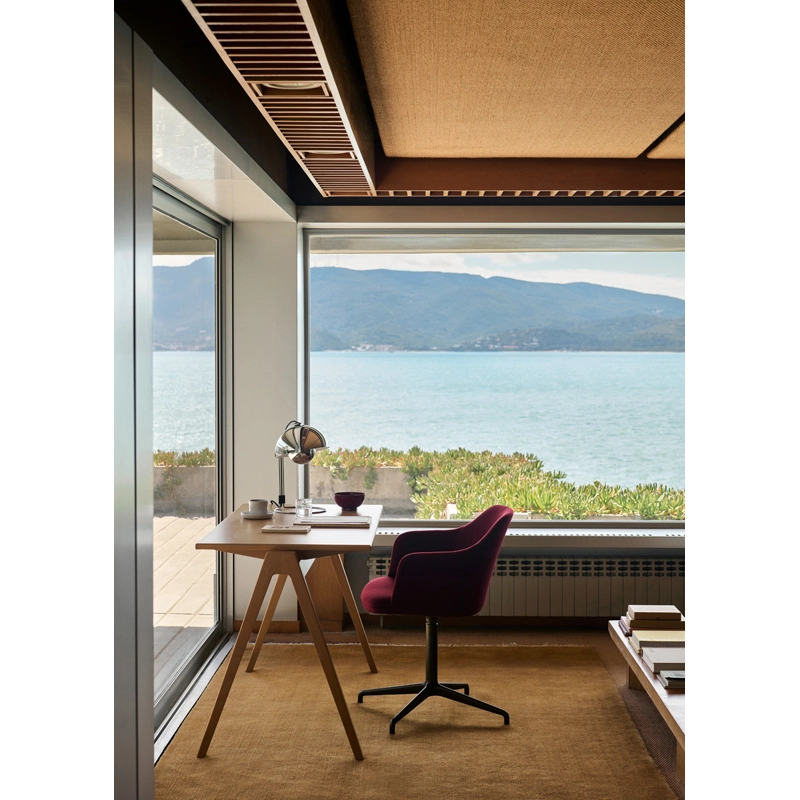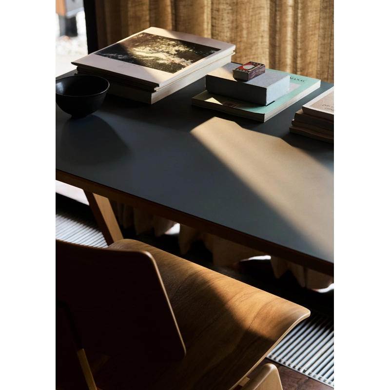 Conçu dans le cadre de la première collection de meubles bon marché de Day pour Hille en 1951, le bureau Daystak s'associe parfaitement à la chaise de la même collection, présentant les mêmes pieds en forme de A. Le bureau Daystack est disponible avec ou sans tiroirs. Ces derniers peuvent être fixés d'un côté ou de l'autre du bureau au moment de l’installation. Le bureau Daystak And Tradition est disponible en hêtre massif, avec ou sans plateau stratifié Fenix Nano dans la teinte Verde Comodoro.  Soucieuse de préserver l'essence de la collection, la marque And Tradition a collaboré avec la Fondation Robin et Lucienne Day pour s'assurer que toutes les pièces rééditées restent aussi fidèles que possible au design original, en y apportant seulement quelques ajustements mineurs pour répondre aux besoins et aux considérations d'impact des utilisateurs du 21e siècle.