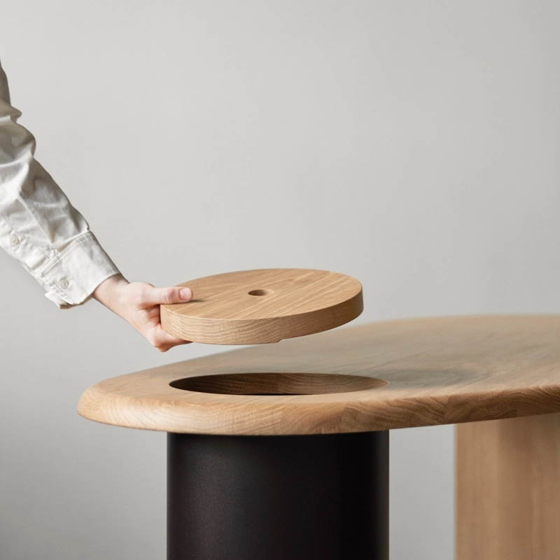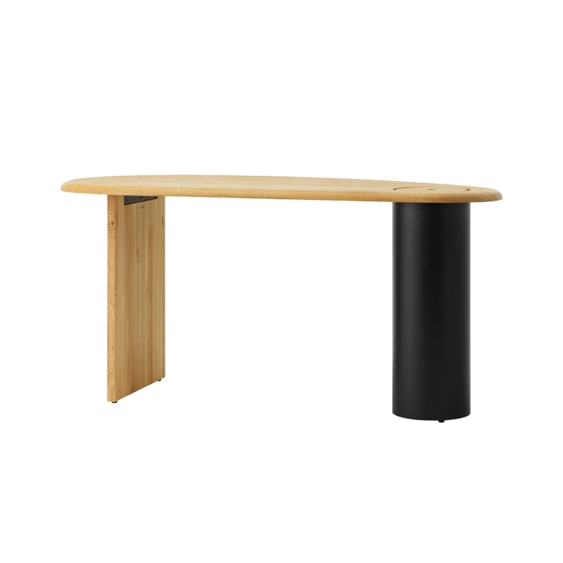 Conçu par Fred Rigby Studio pour la marque Menu, le bureau Eclipse célèbre les matériaux et les formes. Il se distingue par sa silhouette asymétrique qui invité au toucher. Il est disponible en chêne huilé naturel ou foncé avec un pied cylindrique noir. Le plateau du bureau Eclipse est équipé d'un couvercle qui se retire pour révéler un rangement caché dans la colonne en acier. Cet espace astucieux permet au bureau d'être toujours rangé facilement. Elégant et intrigant, le bureau Eclipse de Menu s'installe aussi bien contre un mur qu'au milieu d'une pièce.