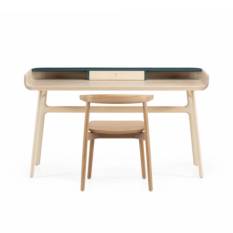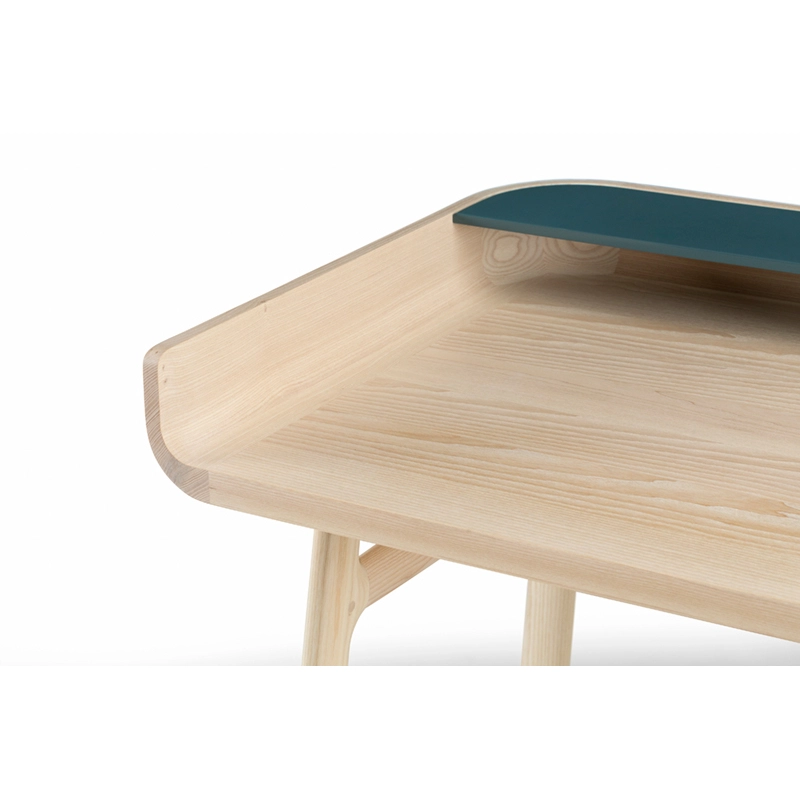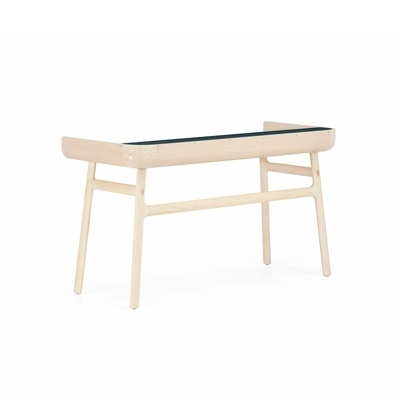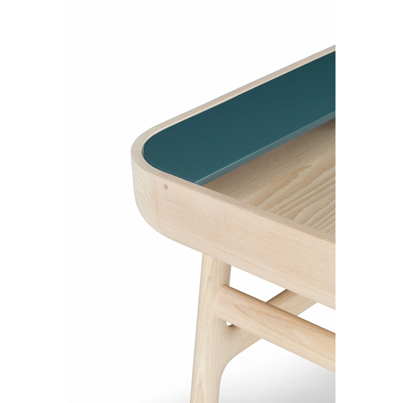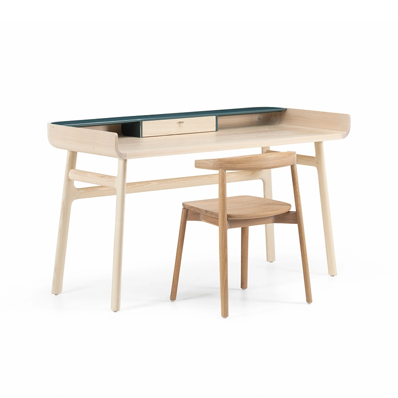Fabriqué en bois avec des touches de laque, Harold est un bureau d'écriture classique doté d'un tiroir de table et d'espaces de rangement ouverts. Les courbes vers le haut sur les côtés du plateau sont usinées à partir de généreuses planches de bois de première qualité. Les pieds minces à cadre en H reliés par des tenons en coin offrent une légèreté visuelle au bureau Harold.