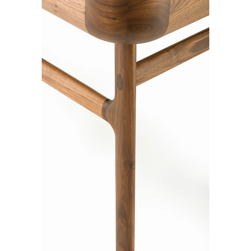 Fabriqué en bois avec des touches de laque, Harold est un bureau d'écriture classique doté d'un tiroir de table et d'espaces de rangement ouverts. Les courbes vers le haut sur les côtés du plateau sont usinées à partir de généreuses planches de bois de première qualité. Les pieds minces à cadre en H reliés par des tenons en coin offrent une légèreté visuelle au bureau Harold.