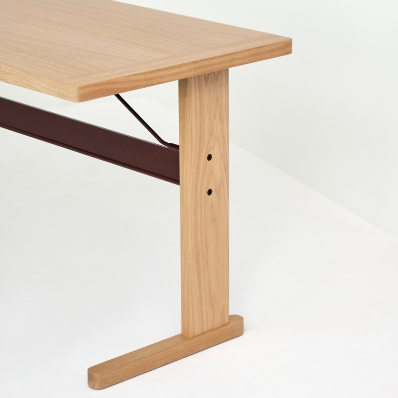 Plateau Lisocore plaqué bois, bords du plateau bois massif, pieds bois massif et contreplaqué, laque à base d'eau, barre transversale acier laqué
