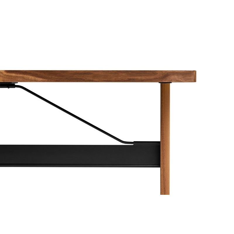 Plateau Lisocore plaqué bois, bords du plateau bois massif, pieds bois massif et contreplaqué, laque à base d'eau, barre transversale acier laqué