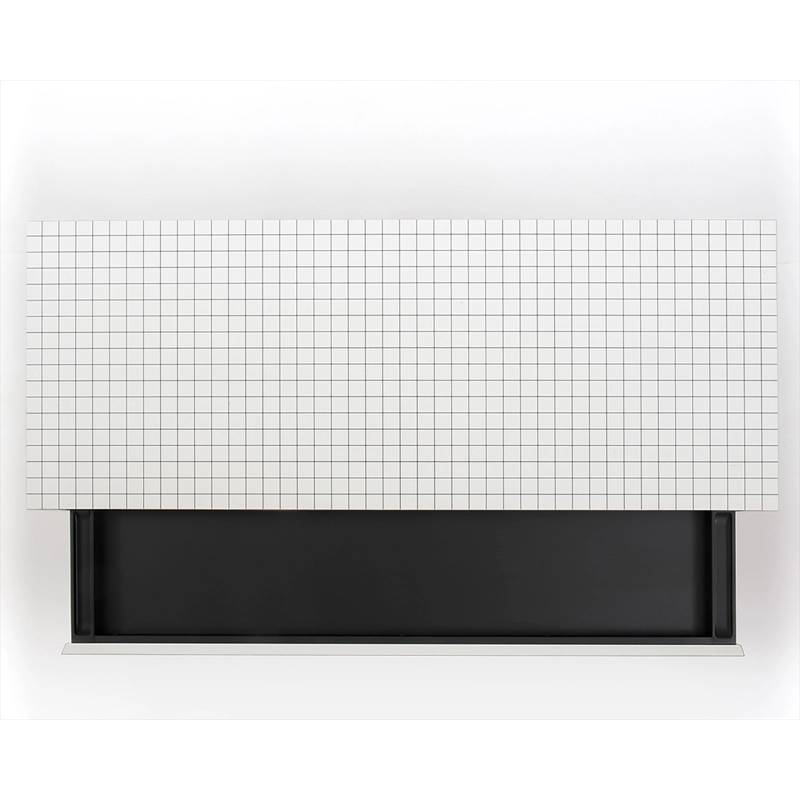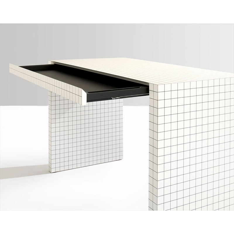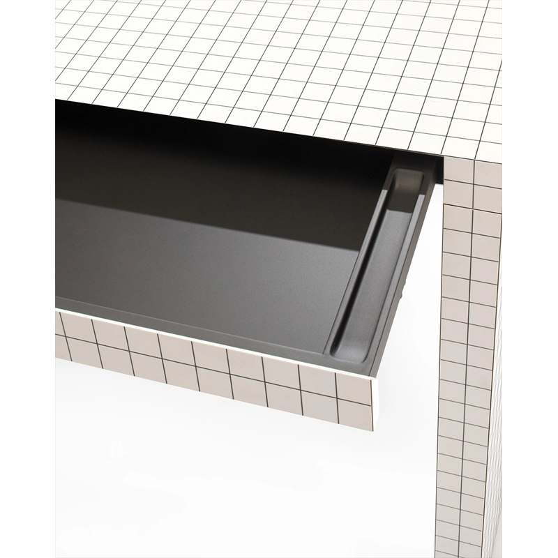 panneau alvéolaire plaqué en print, couleur blanche, imprimé en digital à carrés noirs, intérieur du tiroir bois verni gaufré noir résistant aux rayures