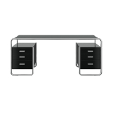 Dessiné par Marcel Breuer, le bureau en acier tubulaire S 285 est une pièce iconique du design contemporain. C’est comme si Marcel Breuer avait anticipé le home office d’aujourd’hui et les ordinateurs portables : le bureau compact S 285 qu’il a conçu est un compagnon élégant pour notre mode de vie moderne et le travail. Le bureau S 285 Thonet est un parfait exemple du style Bauhaus qui visait à combiner l’art et la technologie dans une seule entité. Breuer était un menuisier qualifié et il a combiné ses connaissances de l’acier tubulaire en tant que matériau avec son expérience en design d’intérieur. Le plateau et les éléments de rangement, réalisés en bois teint, sont harmonieusement intégrés dans le cadre en acier tubulaire. La structure est formée par des lignes courbes et les éléments en bois caractérisés par des formes nettes semblent flotter à l’intérieur. Avec ses proportions équilibrées, le bureau S 285 est décliné par Thonet dans différents modèles, tous aussi iconiques et intemporels.