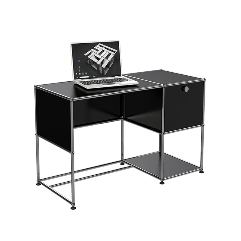 Le bureau home office Haller B21 est équipé d'un module à porte abattante. Il est doté d'une structure en acier chromé assemblé par des boules de connexion, habillée de panneaux d'acier thermolaqué et monté sur des patins réglables en hauteur.  Porte classiques ne nécessitant pas de clefs. (Sécurisée à la livraison, la porte se déverrouille pour la première fois à l’aide d’une pièce ou d’une clef normale)
