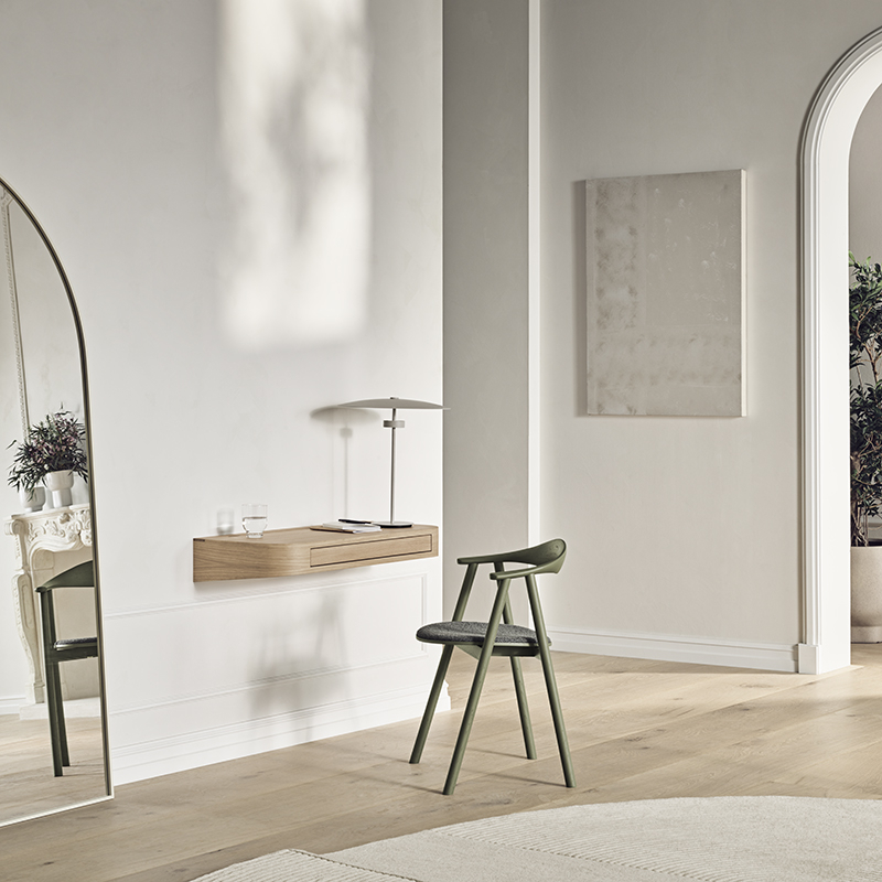 Dessiné par Martin Lauritsen pour Bolia, Vala est un bureau luxueux, conçu avec une forme aux finitions parfaites et des fonctions intelligemment cachées, telles que le rangement et la gestion des câbles. Le bureau Vala est équipé de trois prises de courant sous le bureau et un tiroir spacieux pour votre ordinateur portable, votre carnet de notes ou d’autres objets que vous souhaitez ranger. Ces détails permettent d’organiser et de simplifier ce poste de travail en toute simplicité et élégance. Le bureau se fixe contre le mur avec une suspension invisible, créant une expression simple et minimaliste avec de superbes détails réalisés à la main en placage de chêne. Disponible en deux tailles, le bureau ValaBolia peut aussi être utilisé comme coiffeuse dans la chambre.