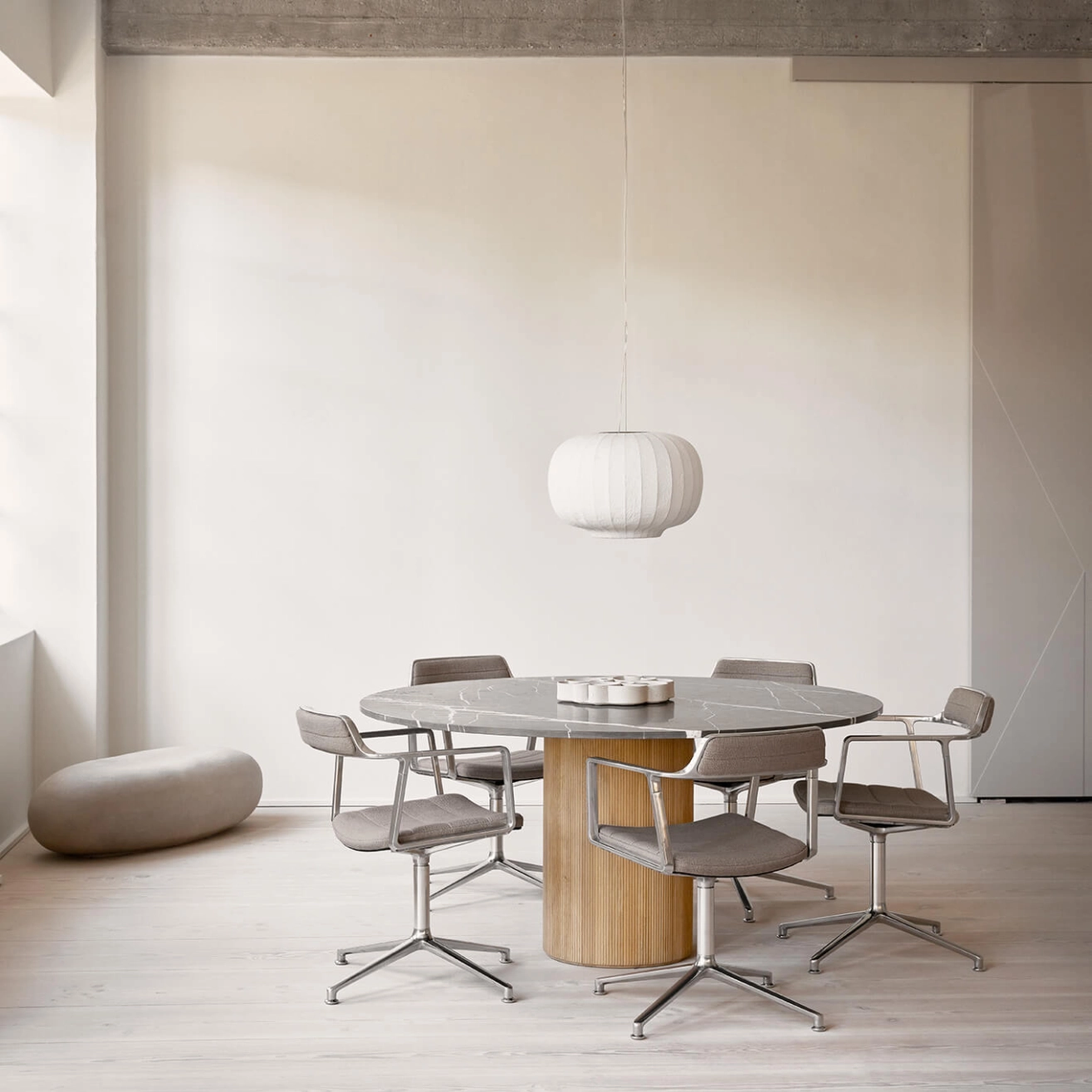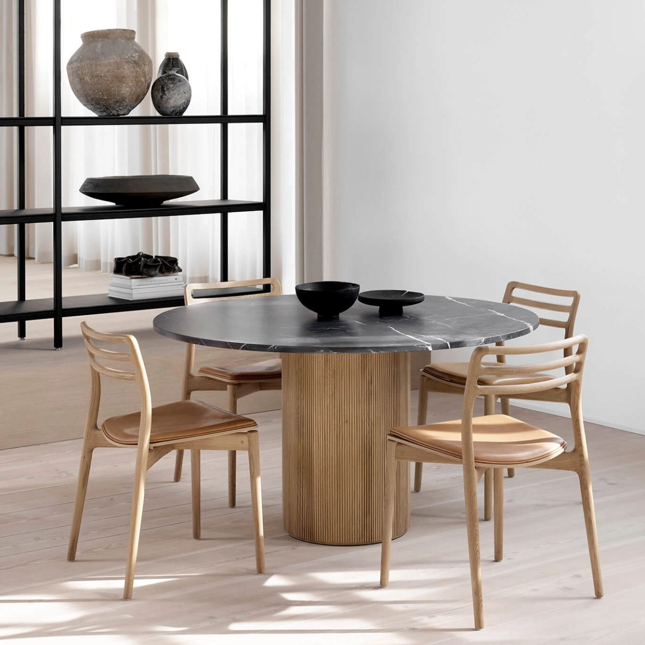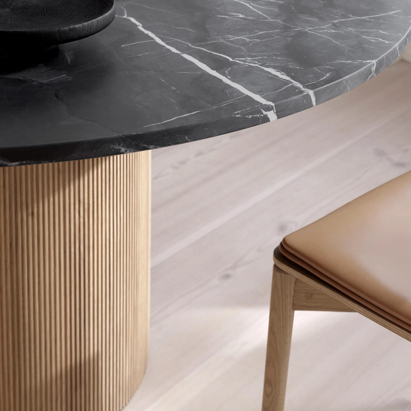 La table Cabin Round est une table aux dimensions variées, disponible en Ø130 et Ø150, conçue par Vipp pour votre salle à manger ou votre cuisine. Cette table se distingue par sa base en chêne massif laqué, disponible en chêne clair ou foncé, et son plateau en marbre. Que ce soit avec une base en métal ou en bois, chaque produit Vipp reflète un raffinement et une attention particulière aux détails. La table Cabin Round ne fait pas exception, avec ses subtiles finitions en bois pour la base et ses bords ronds et sablés du plateau. Chez Vipp, le calcaire et le marbre sont des matériaux récurrents dans nos conceptions de mobilier. L'expression visuelle de ces pierres naturelles raconte l’histoire de millions d'années de transformation géologique. Les veines, fossiles et nuances de couleur résultent de conditions géologiques particulières, garantissant que chaque pierre est unique. Cette singularité est l'une des caractéristiques qui fait de chaque table Cabin Round un produit inimitable de Vipp.
