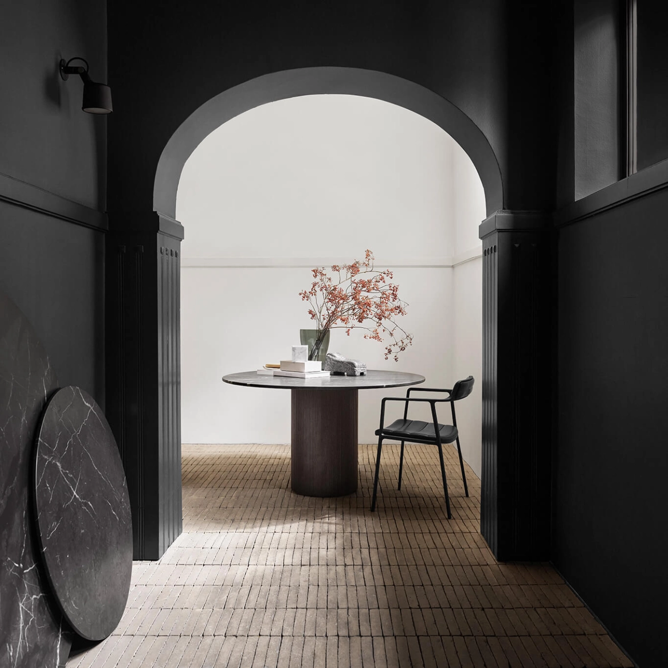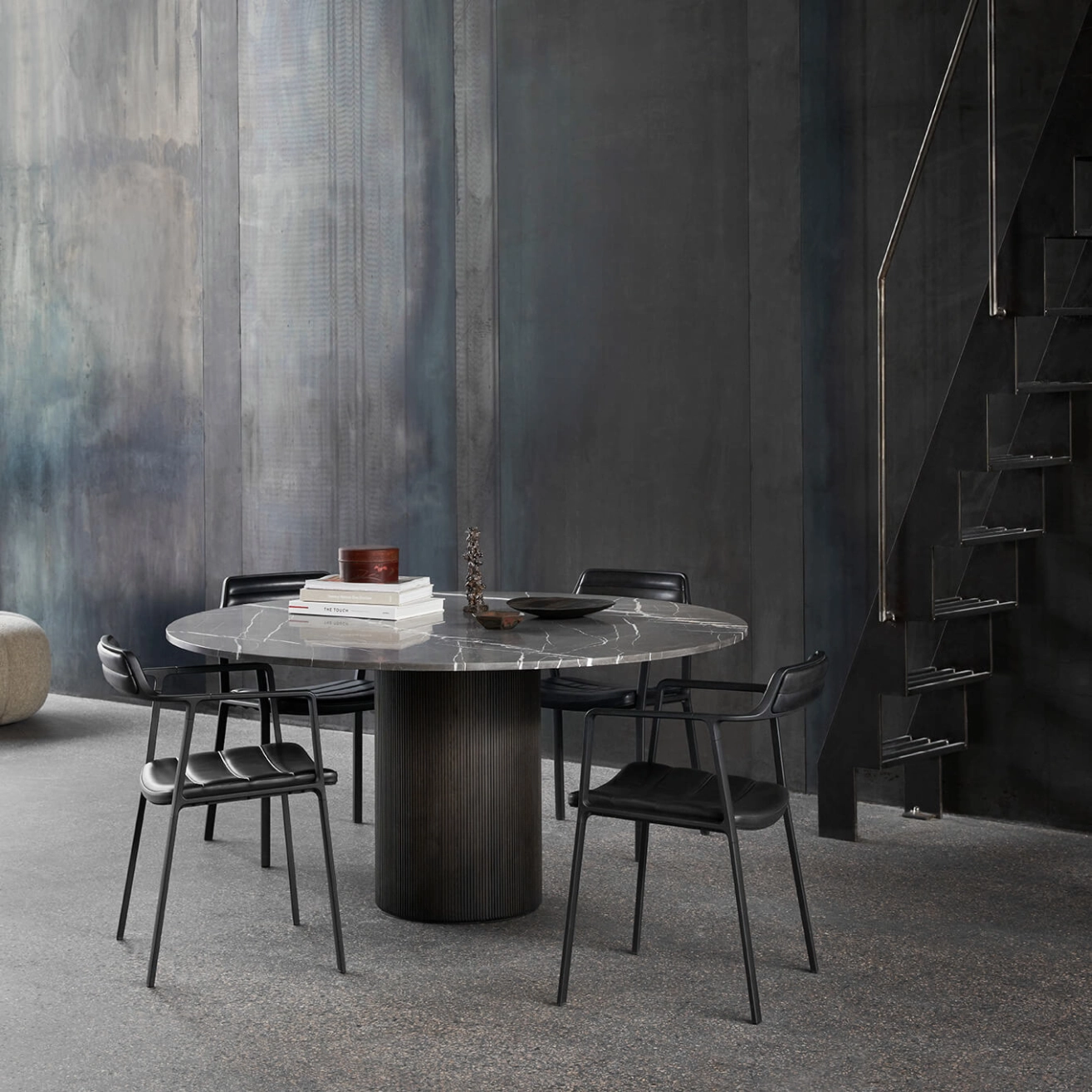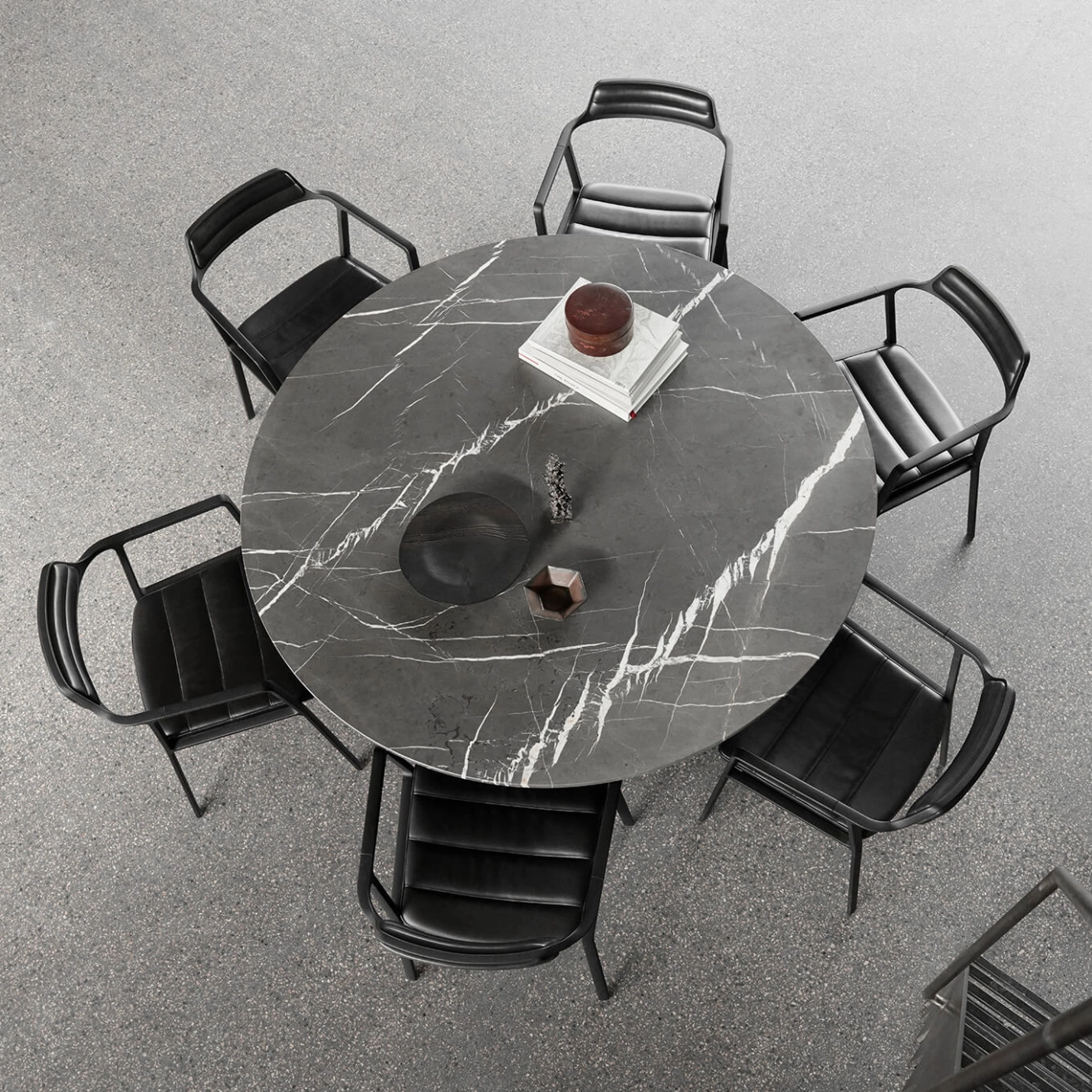 La table Cabin Round est une table aux dimensions variées, disponible en Ø130 et Ø150, conçue par Vipp pour votre salle à manger ou votre cuisine. Cette table se distingue par sa base en chêne massif laqué, disponible en chêne clair ou foncé, et son plateau en marbre. Que ce soit avec une base en métal ou en bois, chaque produit Vipp reflète un raffinement et une attention particulière aux détails. La table Cabin Round ne fait pas exception, avec ses subtiles finitions en bois pour la base et ses bords ronds et sablés du plateau. Chez Vipp, le calcaire et le marbre sont des matériaux récurrents dans nos conceptions de mobilier. L'expression visuelle de ces pierres naturelles raconte l’histoire de millions d'années de transformation géologique. Les veines, fossiles et nuances de couleur résultent de conditions géologiques particulières, garantissant que chaque pierre est unique. Cette singularité est l'une des caractéristiques qui fait de chaque table Cabin Round un produit inimitable de Vipp.