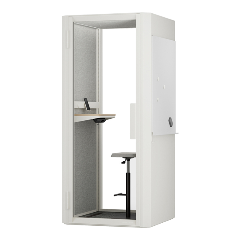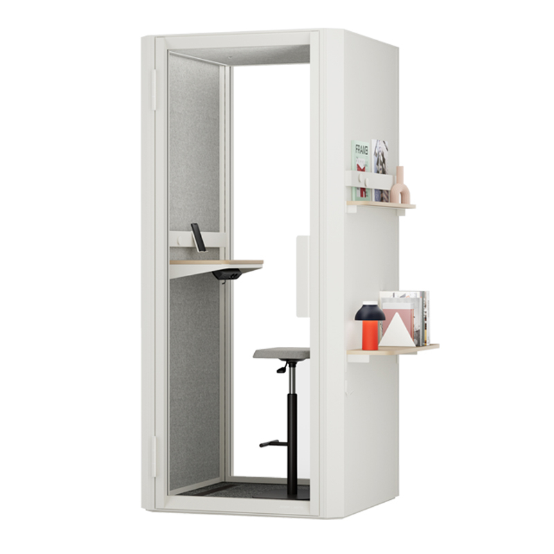 La cabine acoustique Jetson S1 est équipée d'une tablette murale et d'un tabouret réglable en hauteur. Des accessoires sont disponibles en option : - un lot d'étagères élégantes, comprenant une étagère profonde, une étagère étroite, un rail d'affichage, un crochet mural et un support d'exposition. - Un tableau blanc, livré avec un marqueur, une éponge, 3 aimants et un crochet mural
