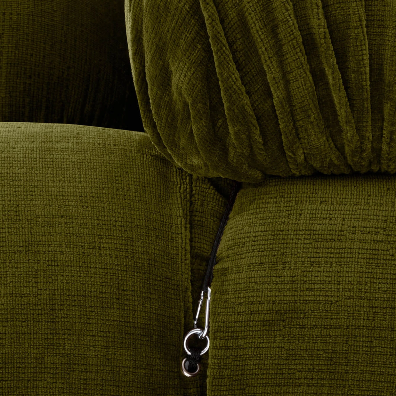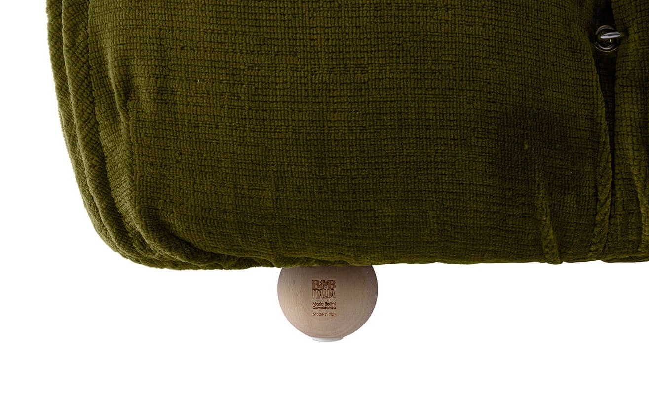 B&B Italia, Pierre Ambrogio Busnelli, ont choisi de conserver le module d’assise de 90x90 cm, ainsi que le dossier et l’accoudoir, fidèles au projet d’origine duquel ont également été récupérés les gabarits d’origine pour la coupe du revêtement. Reste également inchangé le rembourrage généreux en polyuréthane, qui forme le capitonnage caractéristique, obtenu à travers l’innovant système de câbles, crochets et anneaux conçu par Bellini en 1970, qui garantissent son aspect et sa modularité. En effet, grâce à des tirants et anneaux, les modules peuvent se détacher et se recomposer à souhait, en permettant au canapé de s’adapter aux goûts évolutifs et aux nécessités dynamiques des utilisateurs. L’architecte et designer Mario Bellini porte sur sa création un regard particulier : « Parmi tous les objets que j’ai conçus, c’est sans doute