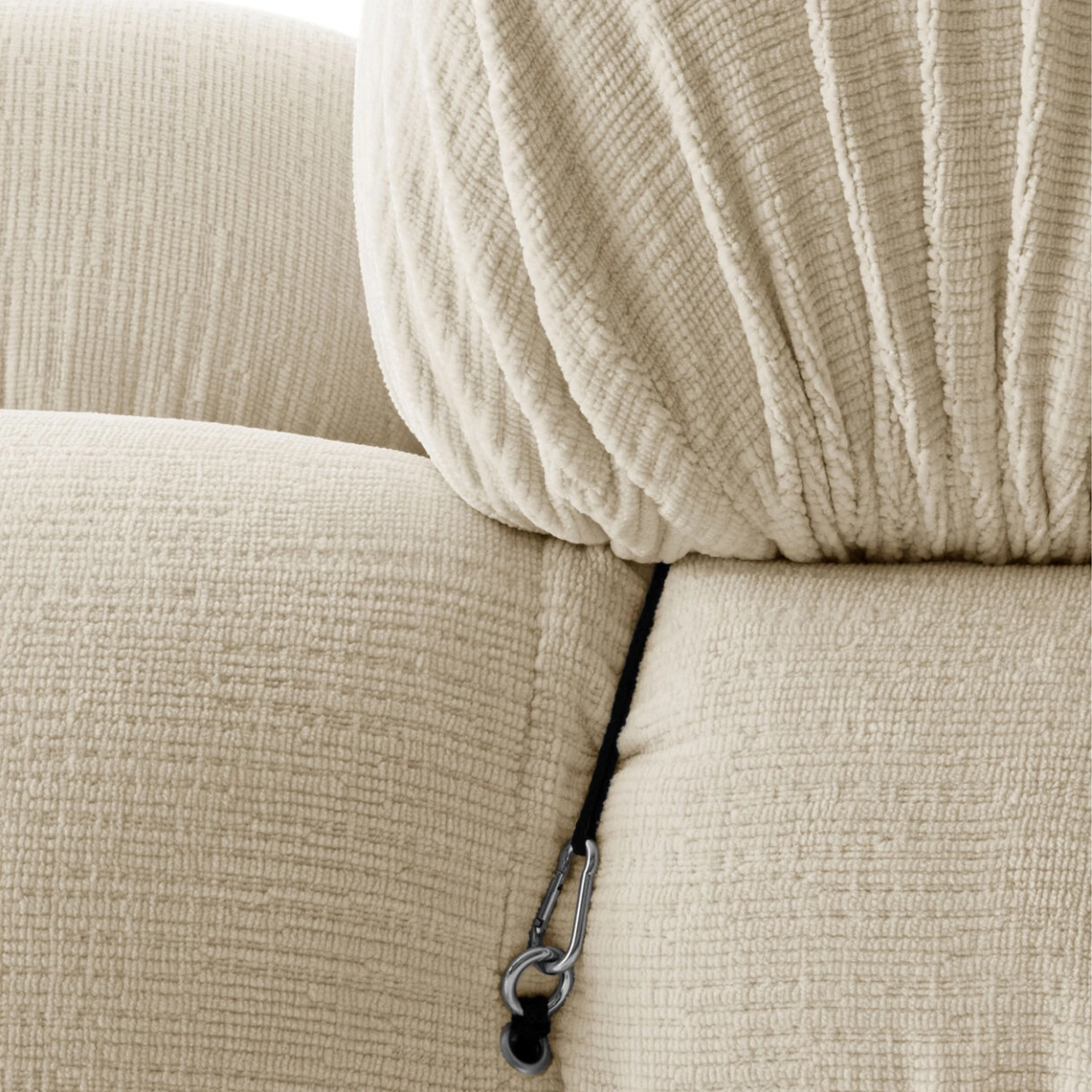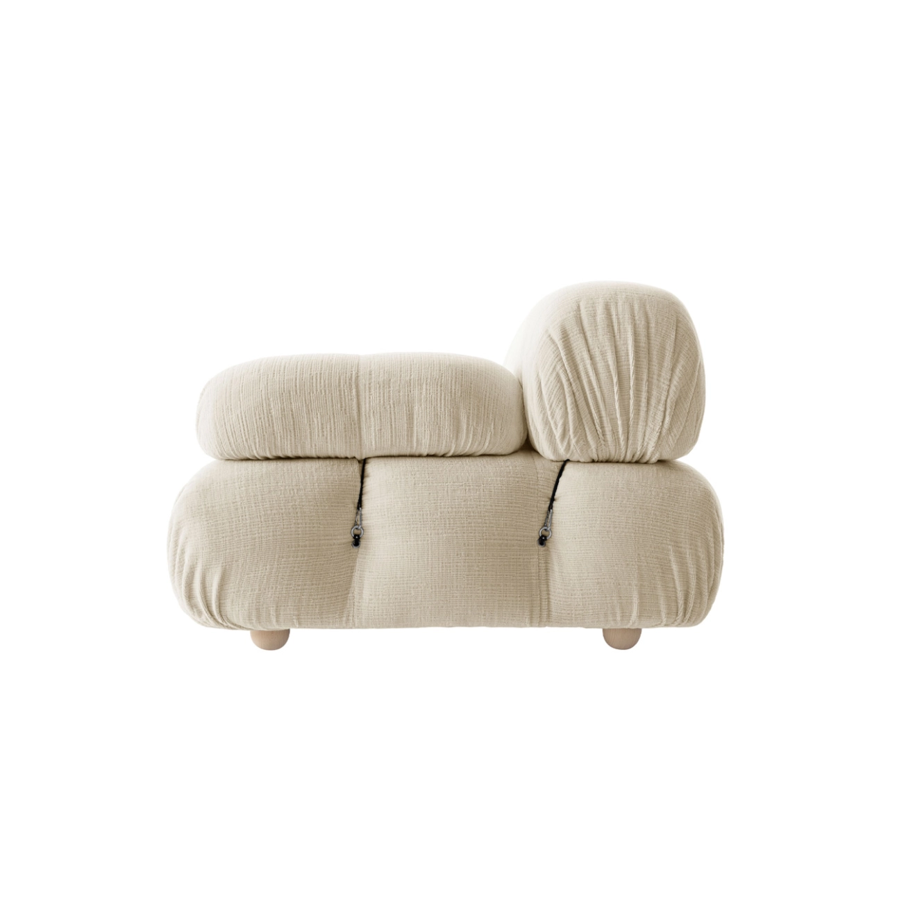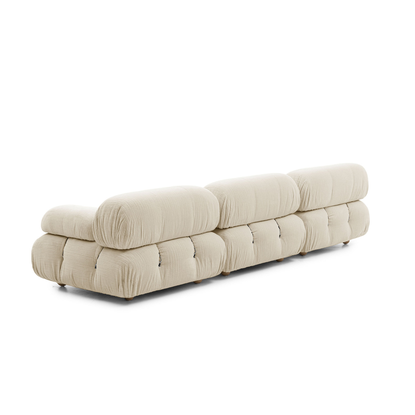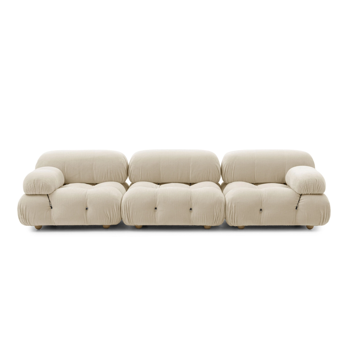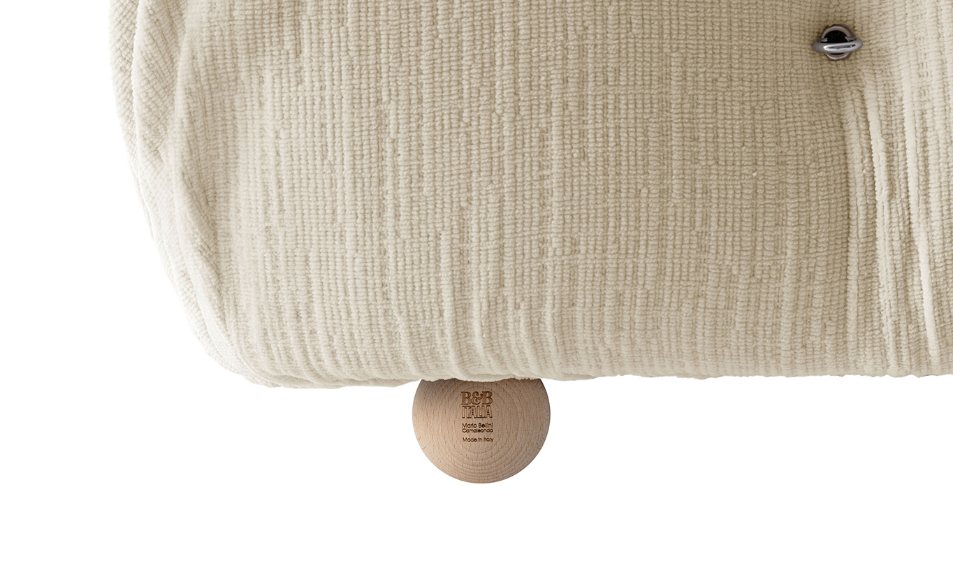 B&B Italia, Pierre Ambrogio Busnelli, ont choisi de conserver le module d’assise de 90x90 cm, ainsi que le dossier et l’accoudoir, fidèles au projet d’origine duquel ont également été récupérés les gabarits d’origine pour la coupe du revêtement. Reste également inchangé le rembourrage généreux en polyuréthane, qui forme le capitonnage caractéristique, obtenu à travers l’innovant système de câbles, crochets et anneaux conçu par Bellini en 1970, qui garantissent son aspect et sa modularité. En effet, grâce à des tirants et anneaux, les modules peuvent se détacher et se recomposer à souhait, en permettant au canapé de s’adapter aux goûts évolutifs et aux nécessités dynamiques des utilisateurs. L’architecte et designer Mario Bellini porte sur sa création un regard particulier : « Parmi tous les objets que j’ai conçus, c’est sans doute