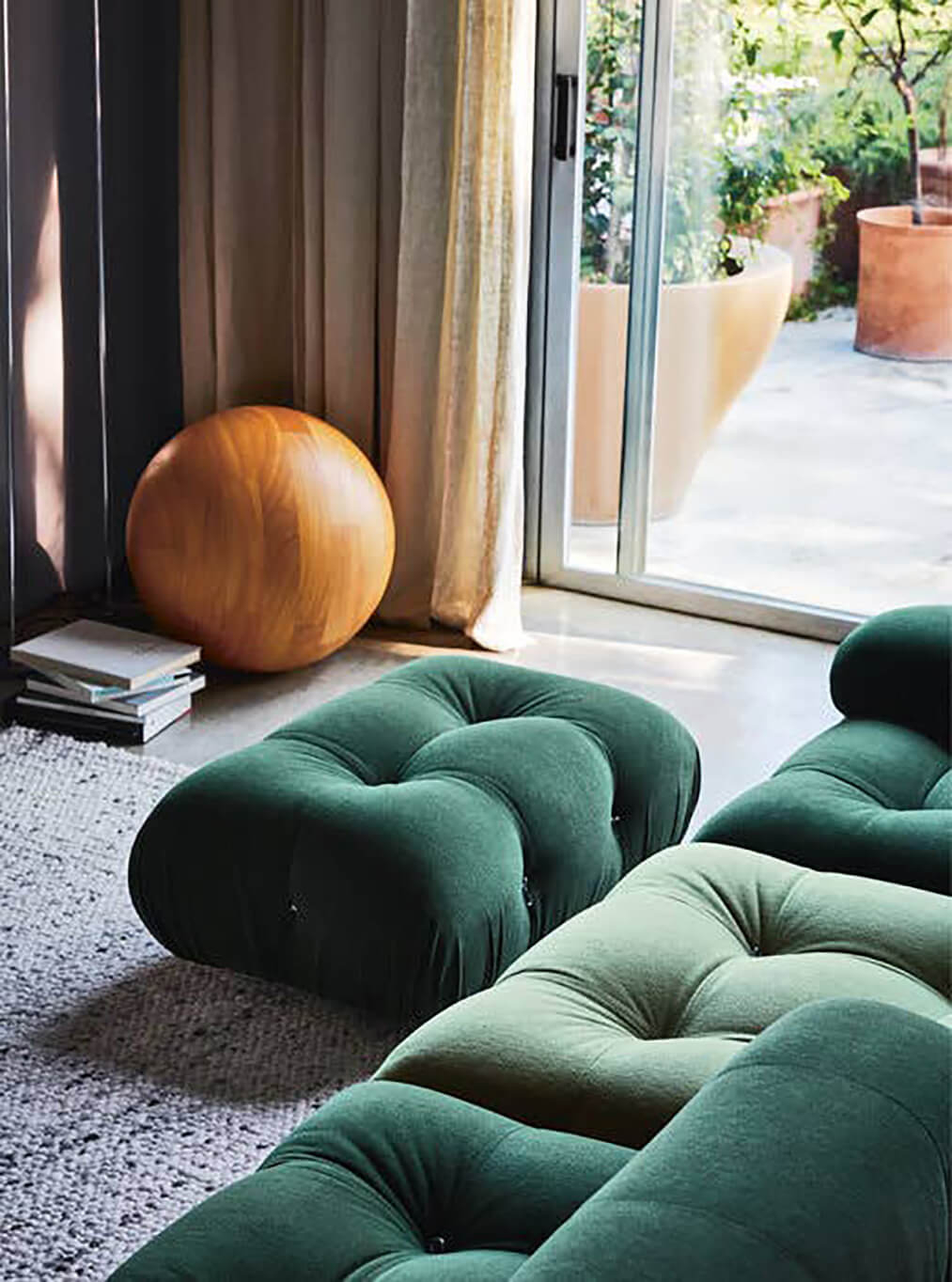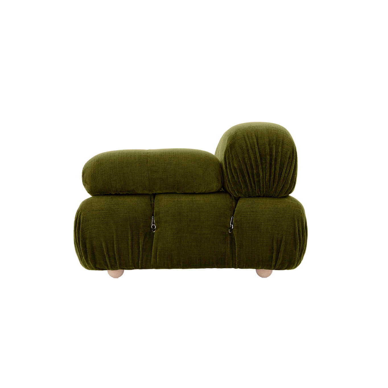 Camaleonda est conçue en panneaux de bois et les pieds sphériques, en hêtre certifié Forest Stewardship Council. Quant à sa housse amovible, le dacron, un tissu synthétique réalisé entièrement en PET recyclé, protège le rembourrage. L’assise de