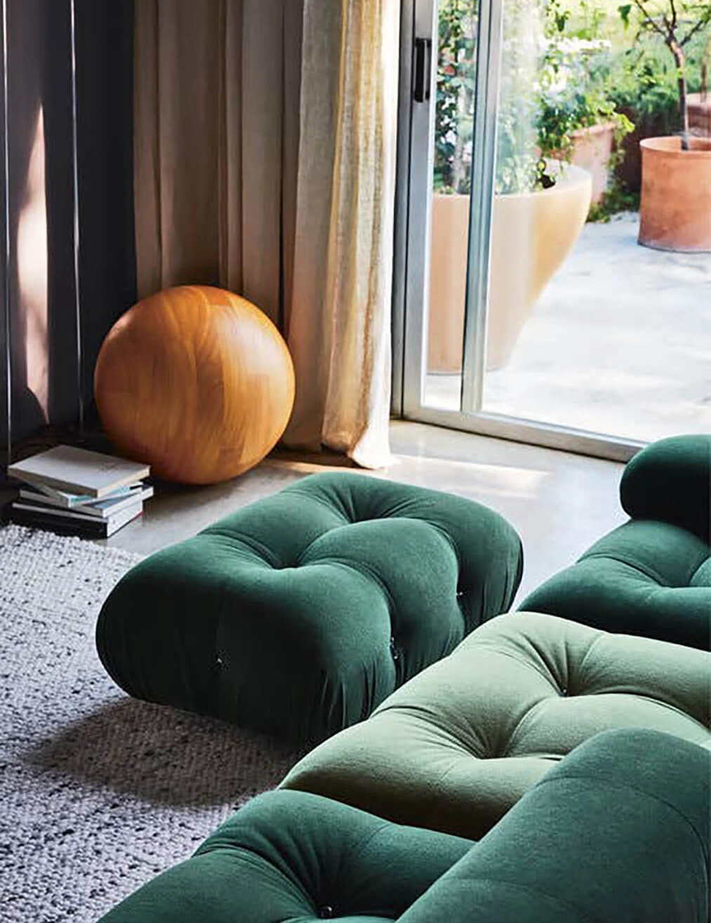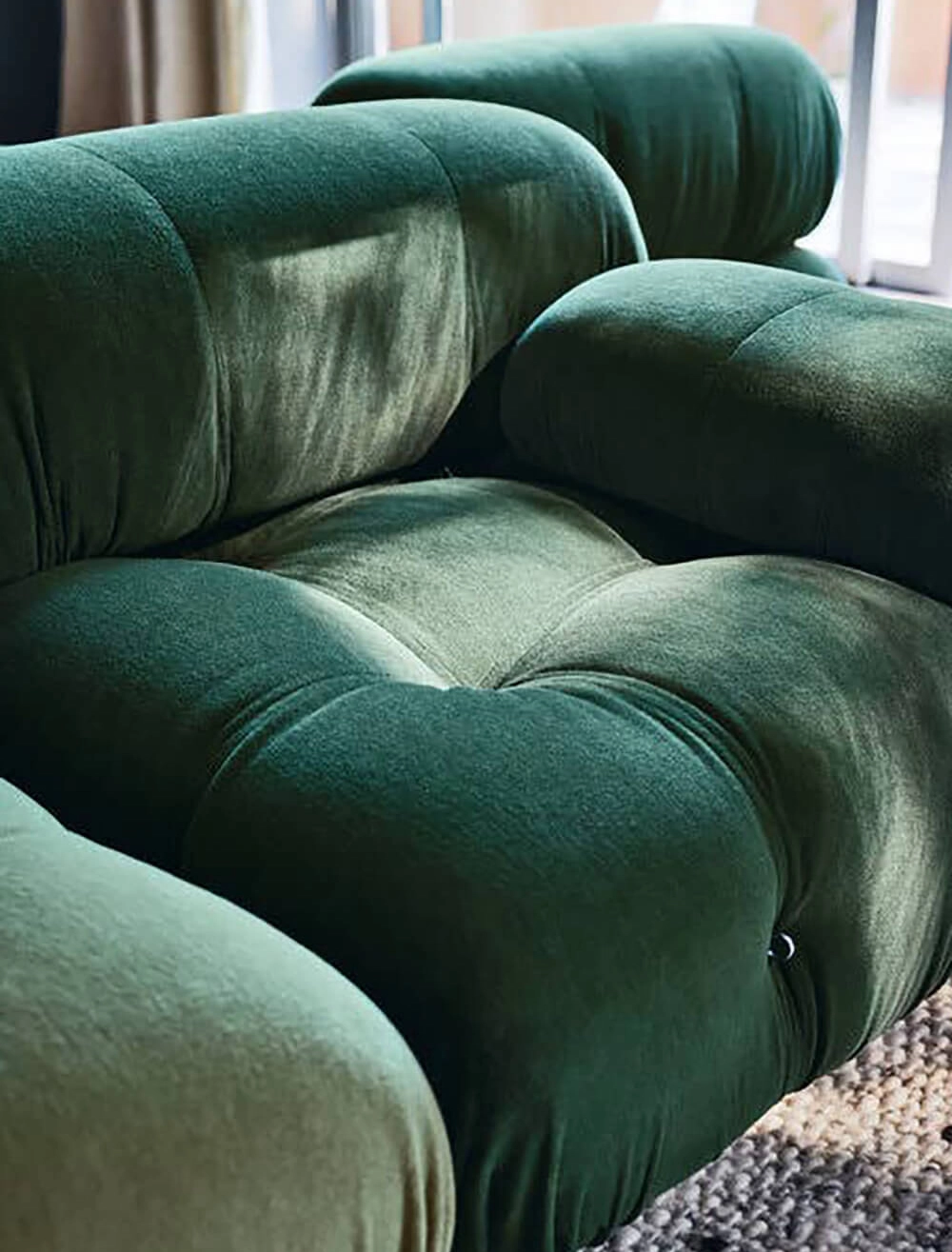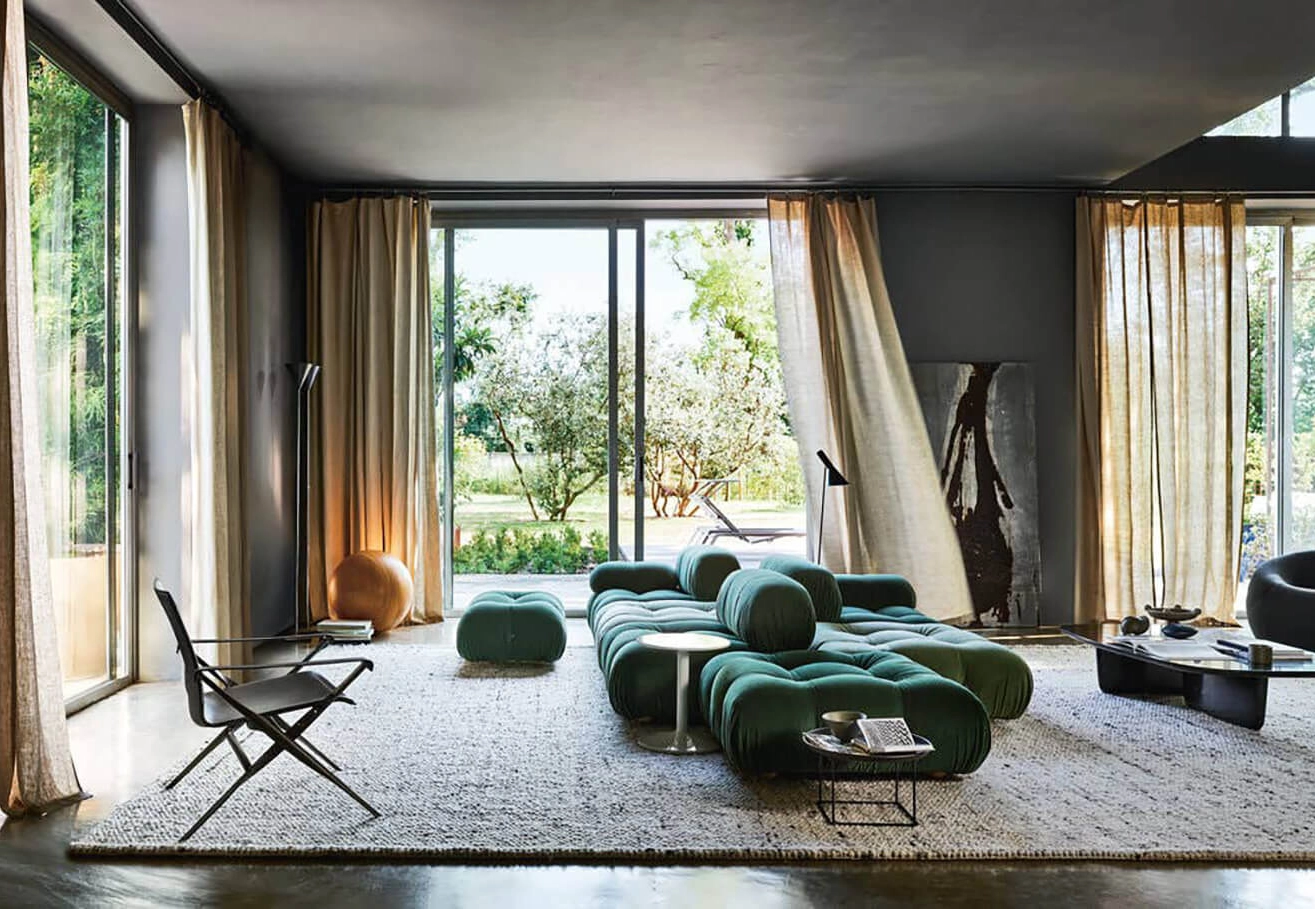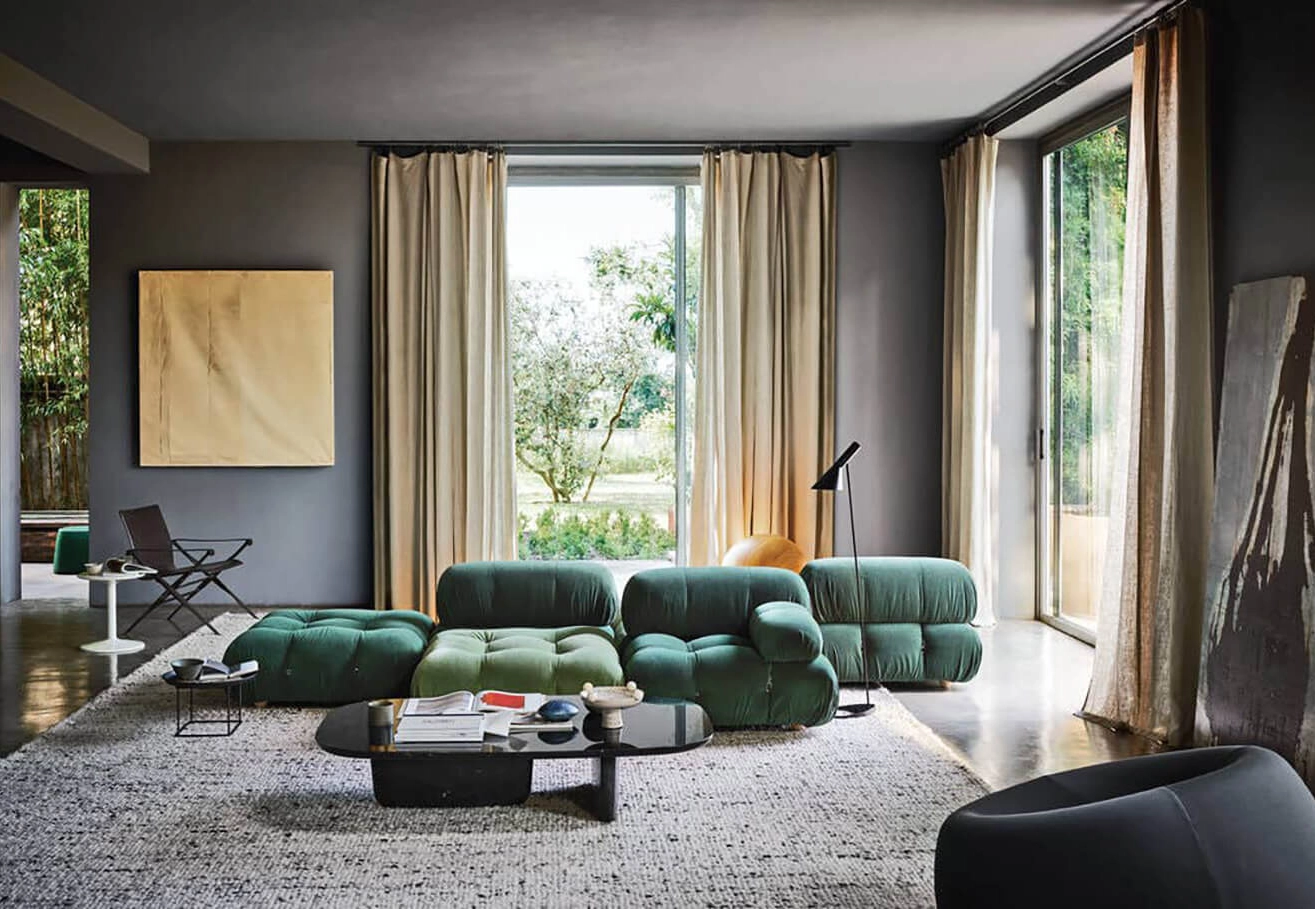Dans sa réédition, Camaleonda conserve les éléments qui en ont fait un classique contemporain. D’un commun accord, Mario Bellini et le fondateur de B&B Italia, Pierre Ambrogio Busnelli, ont choisi de conserver le module d’assise de 90x90 cm, ainsi que le dossier et l’accoudoir, fidèles au projet d’origine duquel ont également été récupérés les gabarits d’origine pour la coupe du revêtement. Reste également inchangé le rembourrage généreux en polyuréthane, qui forme le capitonnage caractéristique, obtenu à travers l’innovant système de câbles, crochets et anneaux conçu par Bellini en 1970, qui garantissent son aspect et sa modularité. En effet, grâce à des tirants et anneaux, les modules peuvent se détacher et se recomposer à souhait, en permettant au canapé de s’adapter aux goûts évolutifs et aux nécessités dynamiques des utilisateurs. L’architecte et designer Mario Bellini porte sur sa création un regard particulier : « Parmi tous les objets que j’ai conçus, c’est sans doute Camaleonda qui représente le mieux le concept de liberté. Les configurations que l’on peut obtenir sont infinies. » Le canapé Camaleonda fut produit de 1970 à 1979. Cependant, en neuf années d’existence, ce canapé modulaire s’est imposé comme une incontestable référence du design italien. Ce n’est donc pas étonnant que cinquante ans après, B&B Italia remet Camaleonda à l’honneur en relançant sa production. Le projet de réédition est lancé en 2019. Il aura fallu près d’une année pour adopter au mieux le canapé aux enjeux actuels. Les matériaux utilisés dans ce canapé sont recyclés et recyclables. La structure de Camaleonda est conçue en panneaux de bois et les pieds sphériques, en hêtre certifié Forest Stewardship Council. Quant à sa housse amovible, le dacron, un tissu synthétique réalisé entièrement en PET recyclé, protège le rembourrage. L’assise de Camaleonda a demandé aux équipes du centre de recherche et développement de B&B Italia un gros travail pour que les diverses couches interagissent les unes avec les autres, qu’elle génère des espaces vides pour créer un effet de ressort moelleux. Le Camaleonda est un objet dynamique, vif et sincère, également modifiable à l’envi en gardant toujours son identité particulière et unique. Une caractéristique fondatrice de Camaleonda est sa modularité pratiquement infinie, une nature géométrique qui permet à chaque élément de devenir une sorte de pixel gigantesque à travers lequel définir son propre environnement domestique. En accrochant et décrochant les assises, les dossiers et les accoudoirs, on peut avoir le luxe de changer d’idée autant de fois qu’on le souhaite, en déplaçant et redessinant l’espace. Camaleonda présente un équilibre magique entre la géométrie rigoureuse du carré et la rondeur accueillante des rembourrages qui souligne encore plus l’élasticité et l’ergonomie tactile qui caractérisent de nombreux projets design de Mario Belline. Camaleonda peut être revêtu en puisant dans l’intégralité de la gamme de tissus et cuirs B&B Italia ce qui permet d’avoir encore plus de combinaisons possibles.