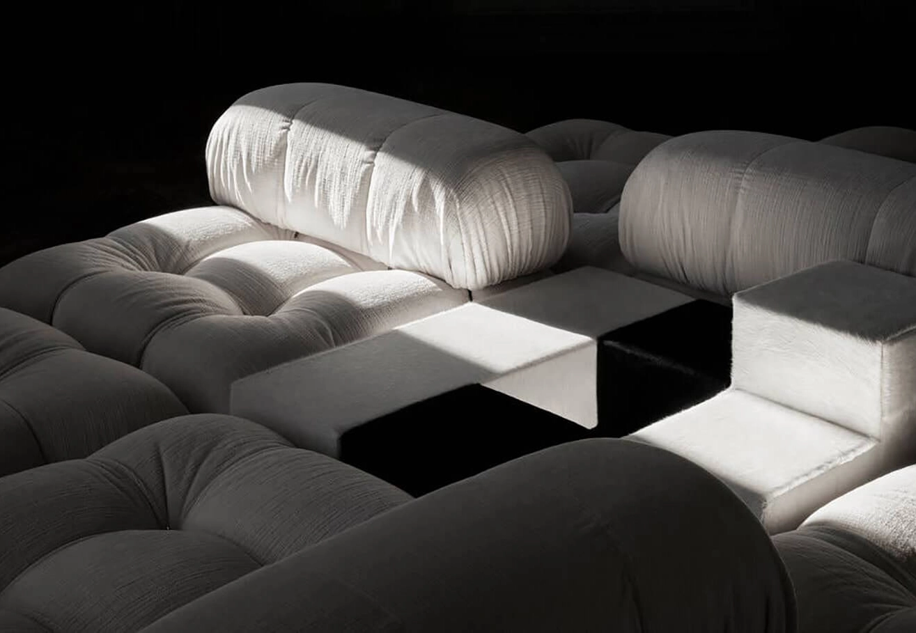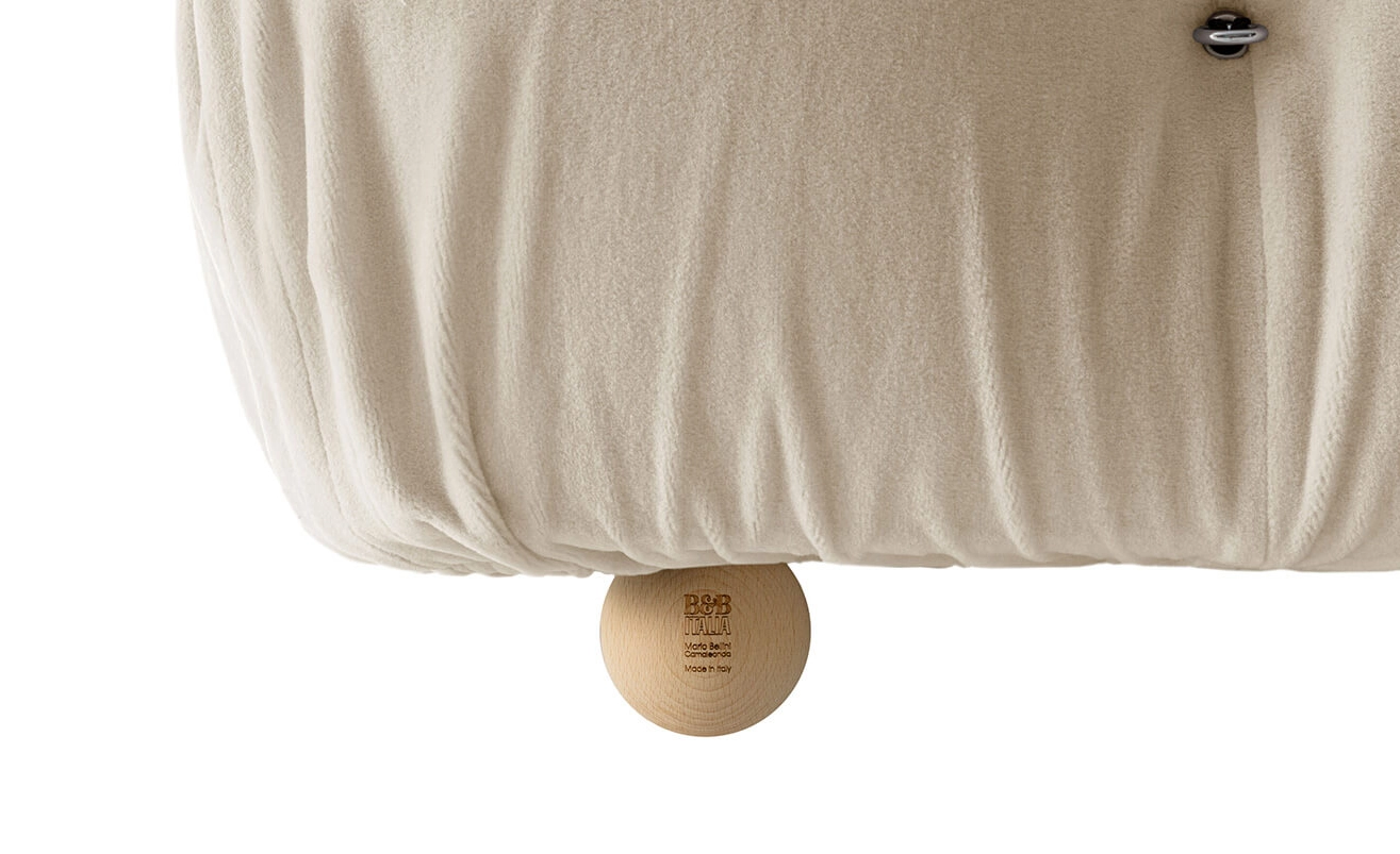 Dans sa réédition, Camaleonda conserve les éléments qui en ont fait un classique contemporain. D’un commun accord, Mario Bellini et le fondateur de B&B Italia, Pierre Ambrogio Busnelli, ont choisi de conserver le module d’assise de 90x90 cm, ainsi que le dossier et l’accoudoir, fidèles au projet d’origine duquel ont également été récupérés les gabarits d’origine pour la coupe du revêtement. Reste également inchangé le rembourrage généreux en polyuréthane, qui forme le capitonnage caractéristique, obtenu à travers l’innovant système de câbles, crochets et anneaux conçu par Bellini en 1970, qui garantissent son aspect et sa modularité. En effet, grâce à des tirants et anneaux, les modules peuvent se détacher et se recomposer à souhait, en permettant au canapé de s’adapter aux goûts évolutifs et aux nécessités dynamiques des utilisateurs. L’architecte et designer Mario Bellini porte sur sa création un regard particulier : « Parmi tous les objets que j’ai conçus, c’est sans doute Camaleonda qui représente le mieux le concept de liberté. Les configurations que l’on peut obtenir sont infinies. » Le canapé Camaleonda fut produit de 1970 à 1979. Cependant, en neuf années d’existence, ce canapé modulaire s’est imposé comme une incontestable référence du design italien. Ce n’est donc pas étonnant que cinquante ans après, B&B Italia remet Camaleonda à l’honneur en relançant sa production. Le projet de réédition est lancé en 2019. Il aura fallu près d’une année pour adopter au mieux le canapé aux enjeux actuels. Les matériaux utilisés dans ce canapé sont recyclés et recyclables. La structure de Camaleonda est conçue en panneaux de bois et les pieds sphériques, en hêtre certifié Forest Stewardship Council. Quant à sa housse amovible, le dacron, un tissu synthétique réalisé entièrement en PET recyclé, protège le rembourrage. L’assise de Camaleonda a demandé aux équipes du centre de recherche et développement de B&B Italia un gros travail pour que les diverses couches interagissent les unes avec les autres, qu’elle génère des espaces vides pour créer un effet de ressort moelleux. Le Camaleonda est un objet dynamique, vif et sincère, également modifiable à l’envi en gardant toujours son identité particulière et unique. Une caractéristique fondatrice de Camaleonda est sa modularité pratiquement infinie, une nature géométrique qui permet à chaque élément de devenir une sorte de pixel gigantesque à travers lequel définir son propre environnement domestique. En accrochant et décrochant les assises, les dossiers et les accoudoirs, on peut avoir le luxe de changer d’idée autant de fois qu’on le souhaite, en déplaçant et redessinant l’espace. Camaleonda présente un équilibre magique entre la géométrie rigoureuse du carré et la rondeur accueillante des rembourrages qui souligne encore plus l’élasticité et l’ergonomie tactile qui caractérisent de nombreux projets design de Mario Belline. Camaleonda peut être revêtu en puisant dans l’intégralité de la gamme de tissus et cuirs B&B Italia ce qui permet d’avoir encore plus de combinaisons possibles.