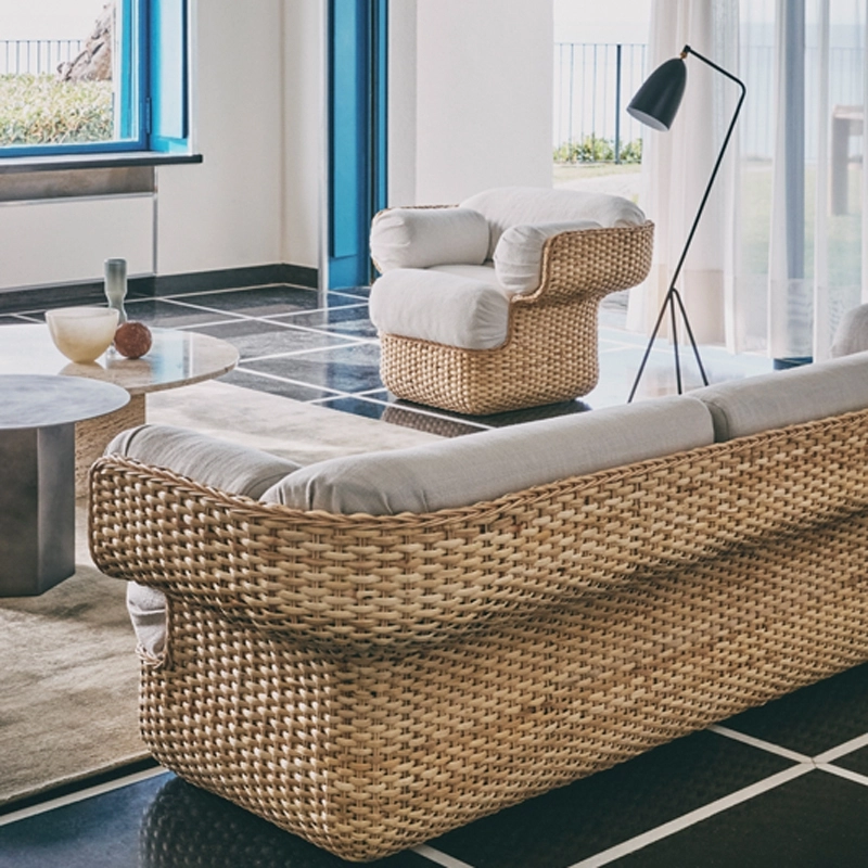 La collection Basket de chez Gubi rend hommage à la technique classique de la vannerie en rotin. La collection comprend un canapé trois places, un canapé deux places et un fauteuil, qui partagent tous la même construction et les mêmes caractéristiques.