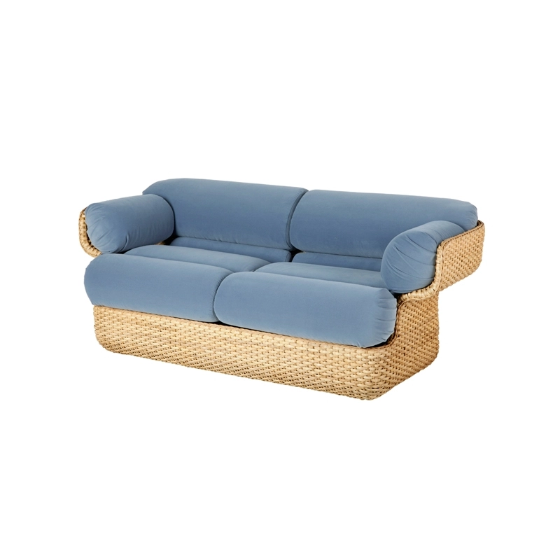 La collection Basket de chez Gubi rend hommage à la technique classique de la vannerie en rotin. La collection comprend un canapé trois places, un canapé deux places et un fauteuil, qui partagent tous la même construction et les mêmes caractéristiques.  Remplaçant la coque intérieure en fibre de verre que Colombo utilisait initialement, le canapé Basket est désormais formé à partir d'un squelette en acier plus respectueux de l'environnement, qui confère résistance et stabilité à la forme unique. La structure est recouverte de rotin tressé à la main, utilisant une technique qui demande un énorme degré d'habileté et de savoir-faire pour sa création. Le canapé Basket est équipé de coussins arrondis sur l'assise et le dossier, fabriqués à partir d'une mousse confortable avec des coussins cylindriques ajoutant une douceur supplémentaire et un effet enveloppant sur les côtés du siège.