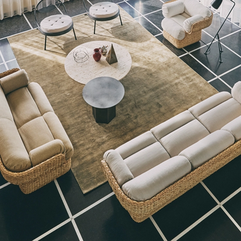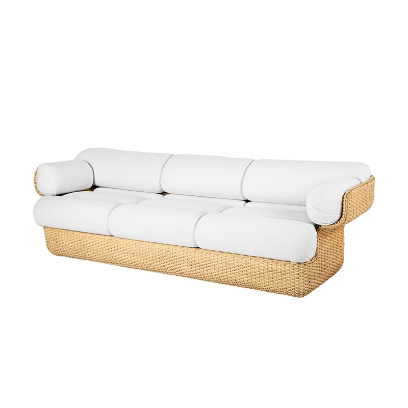 La collection Basket de chez Gubi rend hommage à la technique classique de la vannerie en rotin. La collection comprend un canapé trois places, un canapé deux places et un fauteuil, qui partagent tous la même construction et les mêmes caractéristiques.  Remplaçant la coque intérieure en fibre de verre que Colombo utilisait initialement, le canapé Basket est désormais formé à partir d'un squelette en acier plus respectueux de l'environnement, qui confère résistance et stabilité à la forme unique. La structure est recouverte de rotin tressé à la main, utilisant une technique qui demande un énorme degré d'habileté et de savoir-faire pour sa création. Le canapé Basket est équipé de coussins arrondis sur l'assise et le dossier, fabriqués à partir d'une mousse confortable avec des coussins  cylindriques ajoutant une douceur supplémentaire et un effet enveloppant sur les côtés du siège.