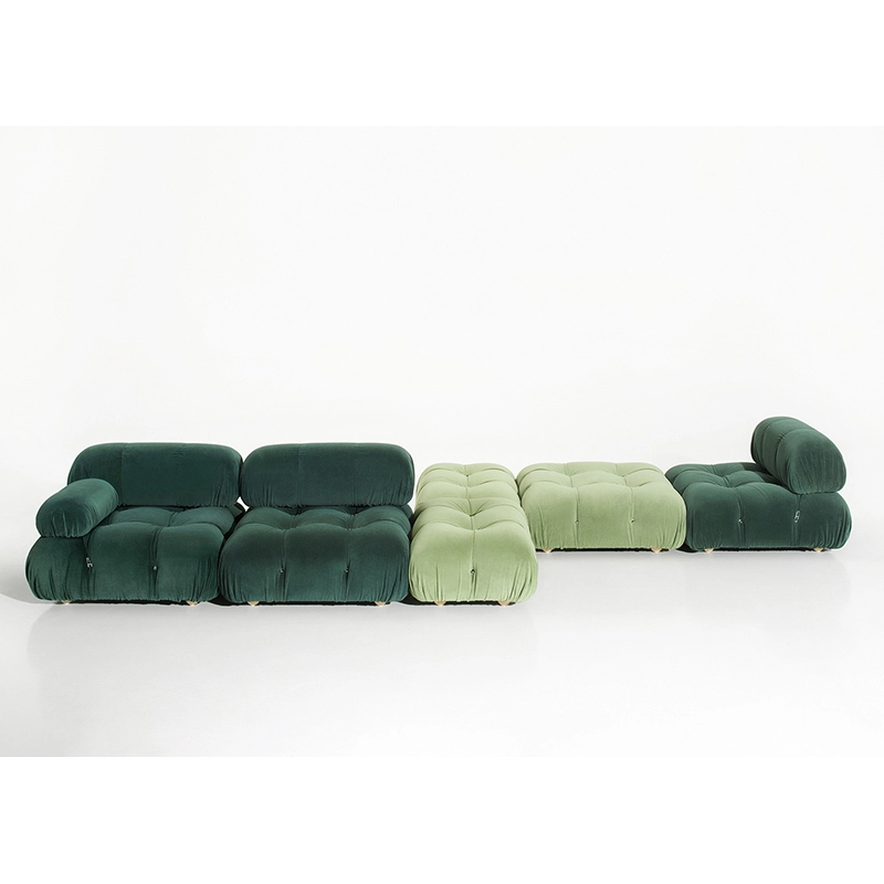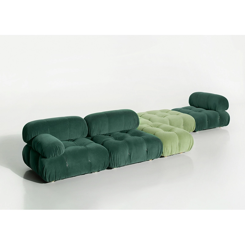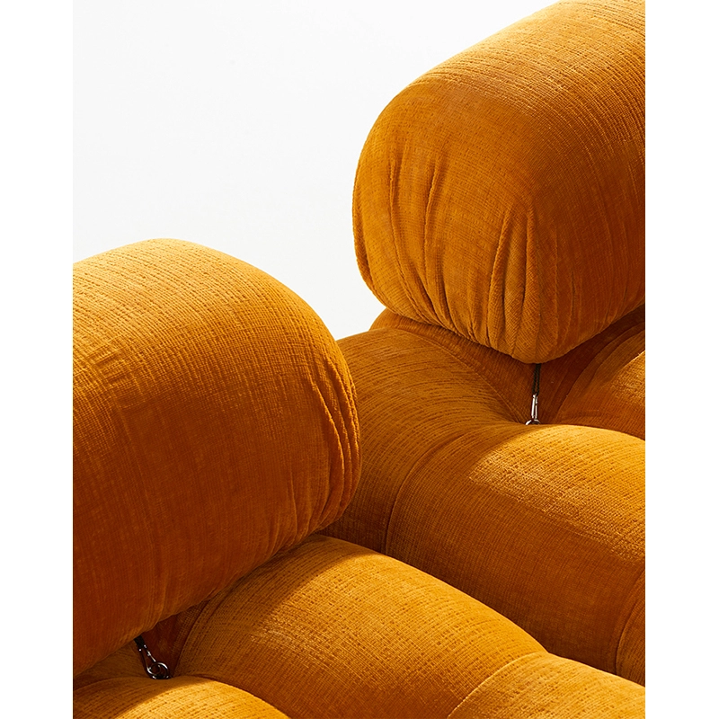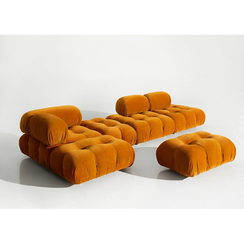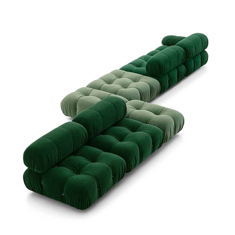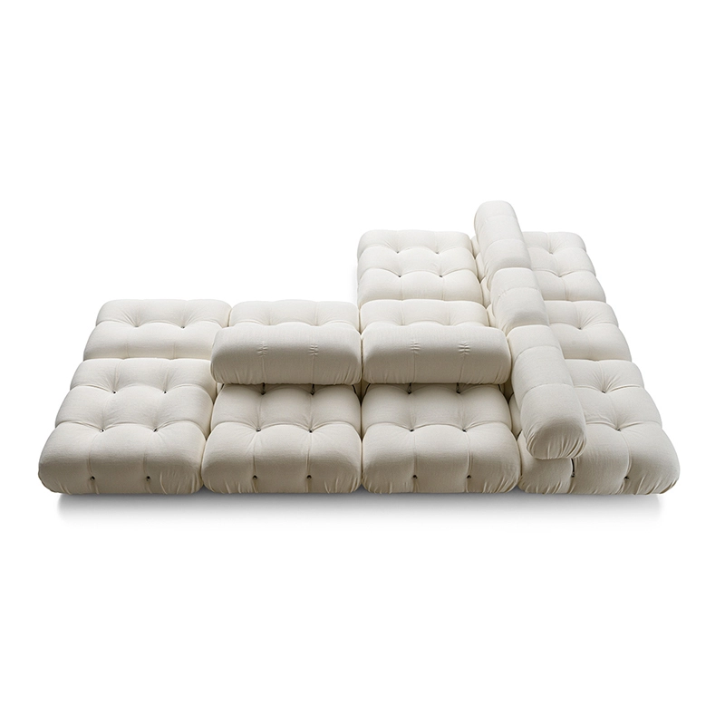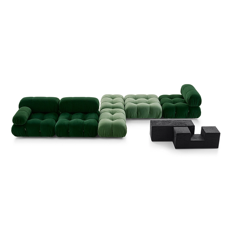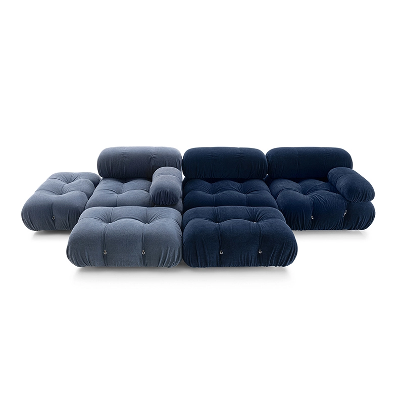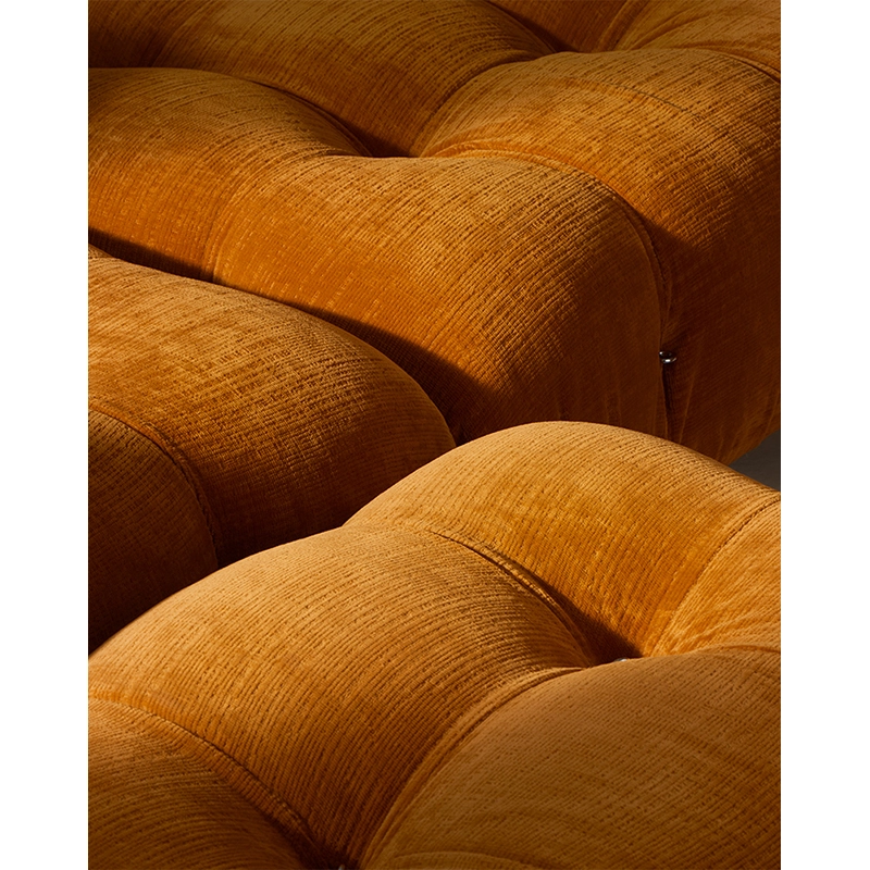 Dans sa réédition, Camaleonda conserve les éléments qui en ont fait un classique contemporain. D’un commun accord, Mario Bellini et le fondateur de B&B Italia, Pierre Ambrogio Busnelli, ont choisi de conserver le module d’assise de 90x90 cm, ainsi que le dossier et l’accoudoir, fidèles au projet d’origine duquel ont également été récupérés les gabarits d’origine pour la coupe du revêtement. Reste également inchangé le rembourrage généreux en polyuréthane, qui forme le capitonnage caractéristique, obtenu à travers l’innovant système de câbles, crochets et anneaux conçu par Bellini en 1970, qui garantissent son aspect et sa modularité. En effet, grâce à des tirants et anneaux, les modules peuvent se détacher et se recomposer à souhait, en permettant au canapé de s’adapter aux goûts évolutifs et aux nécessités dynamiques des utilisateurs. L’architecte et designer Mario Bellini porte sur sa création un regard particulier : « Parmi tous les objets que j’ai conçus, c’est sans doute Camaleonda qui représente le mieux le concept de liberté. Les configurations que l’on peut obtenir sont infinies. » Le canapé Camaleonda fut produit de 1970 à 1979. Cependant, en neuf années d’existence, ce canapé modulaire s’est imposé comme une incontestable référence du design italien. Ce n’est donc pas étonnant que cinquante ans après, B&B Italia remet Camaleonda à l’honneur en relançant sa production. Le projet de réédition est lancé en 2019. Il aura fallu près d’une année pour adopter au mieux le canapé aux enjeux actuels. Les matériaux utilisés dans ce canapé sont recyclés et recyclables. La structure de Camaleonda est conçue en panneaux de bois et les pieds sphériques, en hêtre certifié Forest Stewardship Council. Quant à sa housse amovible, le dacron, un tissu synthétique réalisé entièrement en PET recyclé, protège le rembourrage. L’assise de Camaleonda a demandé aux équipes du centre de recherche et développement de B&B Italia un gros travail pour que les diverses couches interagissent les unes avec les autres, qu’elle génère des espaces vides pour créer un effet de ressort moelleux. Le Camaleonda est un objet dynamique, vif et sincère, également modifiable à l’envi en gardant toujours son identité particulière et unique. Une caractéristique fondatrice de Camaleonda est sa modularité pratiquement infinie, une nature géométrique qui permet à chaque élément de devenir une sorte de pixel gigantesque à travers lequel définir son propre environnement domestique. En accrochant et décrochant les assises, les dossiers et les accoudoirs, on peut avoir le luxe de changer d’idée autant de fois qu’on le souhaite, en déplaçant et redessinant l’espace. Camaleonda présente un équilibre magique entre la géométrie rigoureuse du carré et la rondeur accueillante des rembourrages qui souligne encore plus l’élasticité et l’ergonomie tactile qui caractérisent de nombreux projets design de Mario Belline. Camaleonda peut être revêtu en puisant dans l’intégralité de la gamme de tissus et cuirs B&B Italia ce qui permet d’avoir encore plus de combinaisons possibles.
