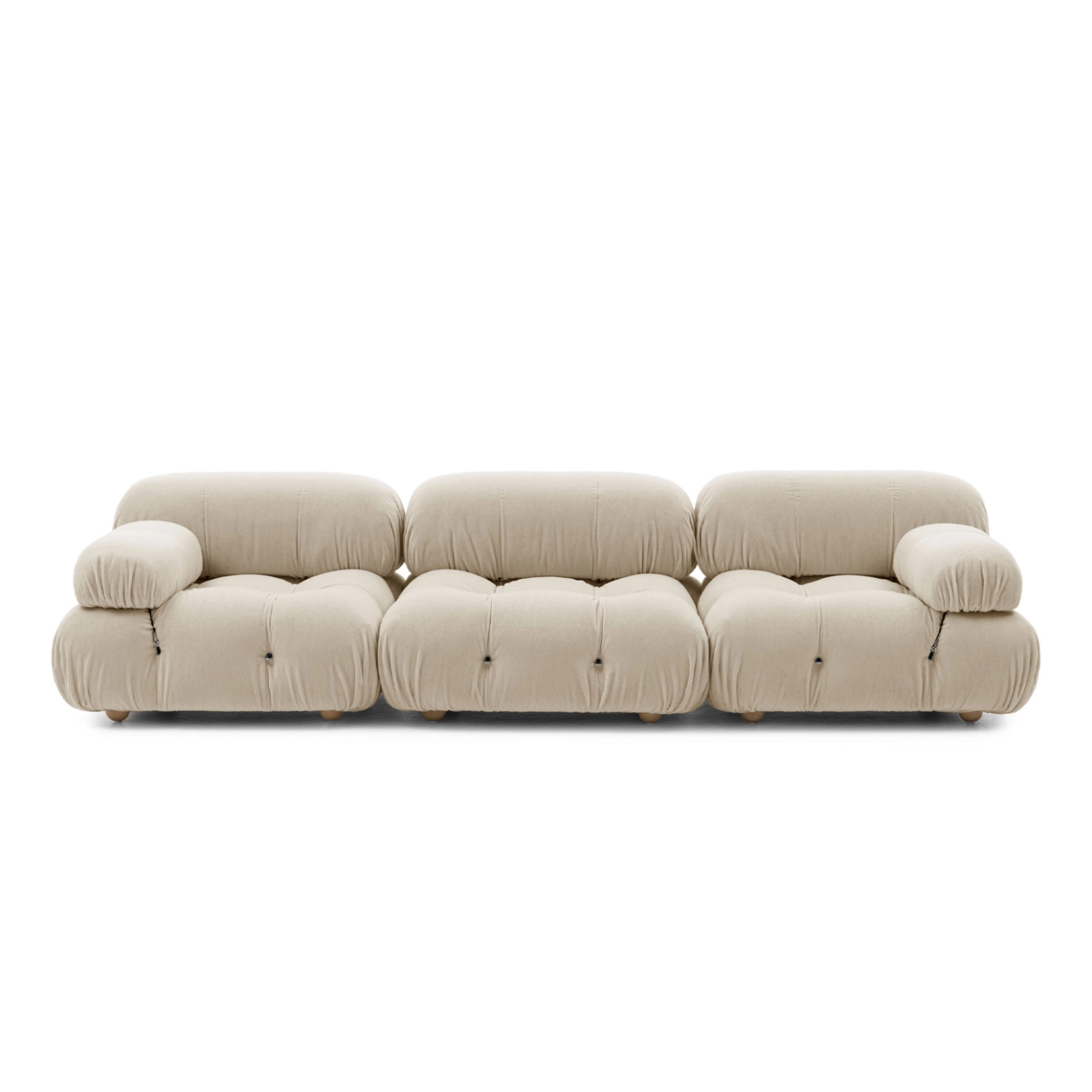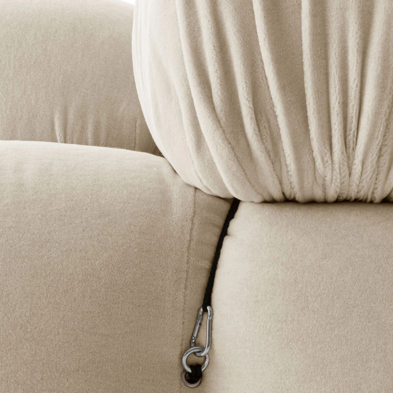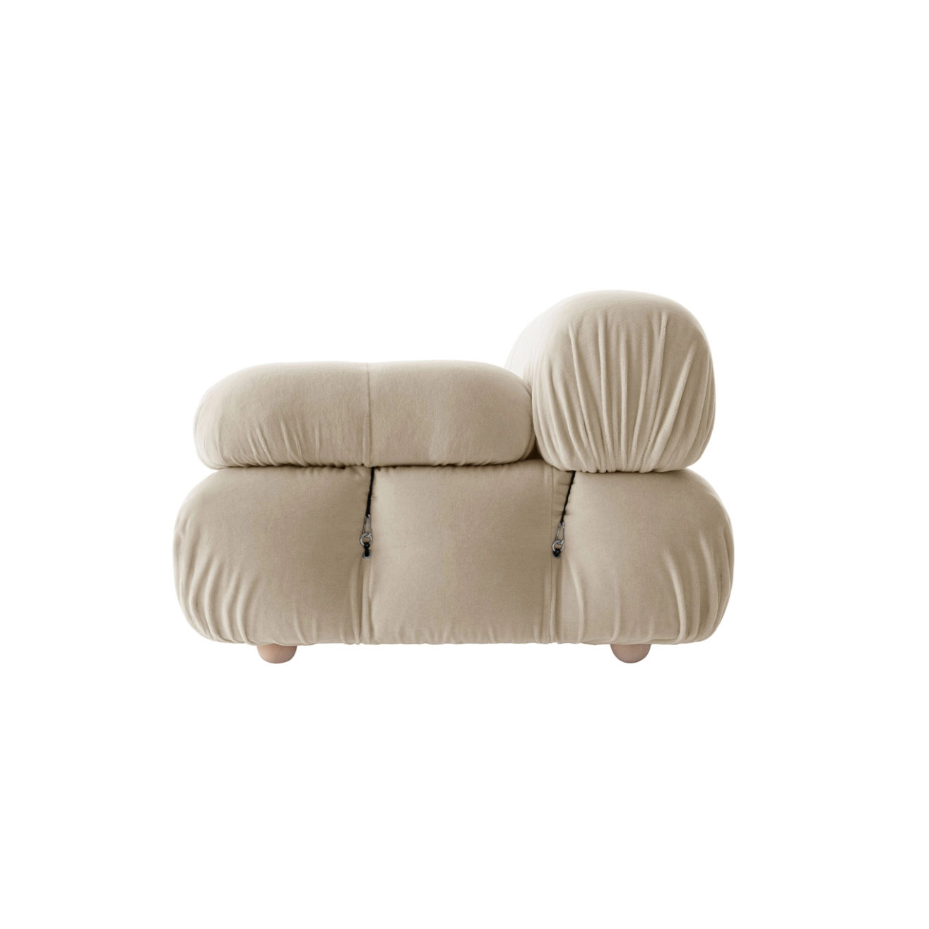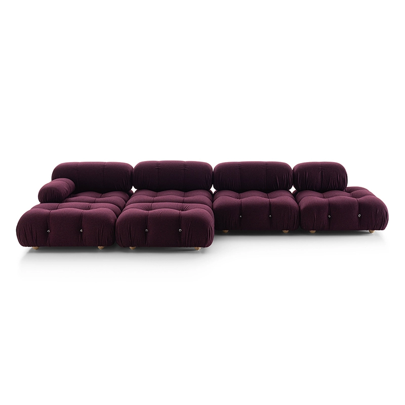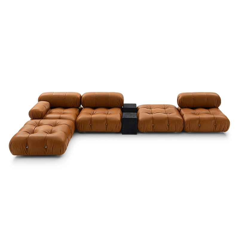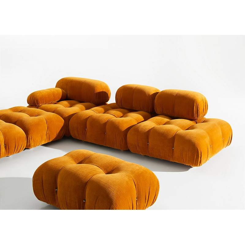Dans sa réédition, Camaleonda conserve les éléments qui en ont fait un classique contemporain. D’un commun accord, Mario Bellini et le fondateur de B&B Italia, Pierre Ambrogio Busnelli, ont choisi de conserver le module d’assise de 90x90 cm, ainsi que le dossier et l’accoudoir, fidèles au projet d’origine duquel ont également été récupérés les gabarits d’origine pour la coupe du revêtement. Reste également inchangé le rembourrage généreux en polyuréthane, qui forme le capitonnage caractéristique, obtenu à travers l’innovant système de câbles, crochets et anneaux conçu par Bellini en 1970, qui garantissent son aspect et sa modularité. En effet, grâce à des tirants et anneaux, les modules peuvent se détacher et se recomposer à souhait, en permettant au canapé de s’adapter aux goûts évolutifs et aux nécessités dynamiques des utilisateurs. L’architecte et designer Mario Bellini porte sur sa création un regard particulier : « Parmi tous les objets que j’ai conçus, c’est sans doute Camaleonda qui représente le mieux le concept de liberté. Les configurations que l’on peut obtenir sont infinies. » Le canapé Camaleonda fut produit de 1970 à 1979. Cependant, en neuf années d’existence, ce canapé modulaire s’est imposé comme une incontestable référence du design italien. Ce n’est donc pas étonnant que cinquante ans après, B&B Italia remet Camaleonda à l’honneur en relançant sa production. Le projet de réédition est lancé en 2019. Il aura fallu près d’une année pour adopter au mieux le canapé aux enjeux actuels. Les matériaux utilisés dans ce canapé sont recyclés et recyclables. La structure de Camaleonda est conçue en panneaux de bois et les pieds sphériques, en hêtre certifié Forest Stewardship Council. Quant à sa housse amovible, le dacron, un tissu synthétique réalisé entièrement en PET recyclé, protège le rembourrage. L’assise de Camaleonda a demandé aux équipes du centre de recherche et développement de B&B Italia un gros travail pour que les diverses couches interagissent les unes avec les autres, qu’elle génère des espaces vides pour créer un effet de ressort moelleux. Le Camaleonda est un objet dynamique, vif et sincère, également modifiable à l’envi en gardant toujours son identité particulière et unique. Une caractéristique fondatrice de Camaleonda est sa modularité pratiquement infinie, une nature géométrique qui permet à chaque élément de devenir une sorte de pixel gigantesque à travers lequel définir son propre environnement domestique. En accrochant et décrochant les assises, les dossiers et les accoudoirs, on peut avoir le luxe de changer d’idée autant de fois qu’on le souhaite, en déplaçant et redessinant l’espace. Camaleonda présente un équilibre magique entre la géométrie rigoureuse du carré et la rondeur accueillante des rembourrages qui souligne encore plus l’élasticité et l’ergonomie tactile qui caractérisent de nombreux projets design de Mario Belline. Camaleonda peut être revêtu en puisant dans l’intégralité de la gamme de tissus et cuirs B&B Italia ce qui permet d’avoir encore plus de combinaisons possibles.