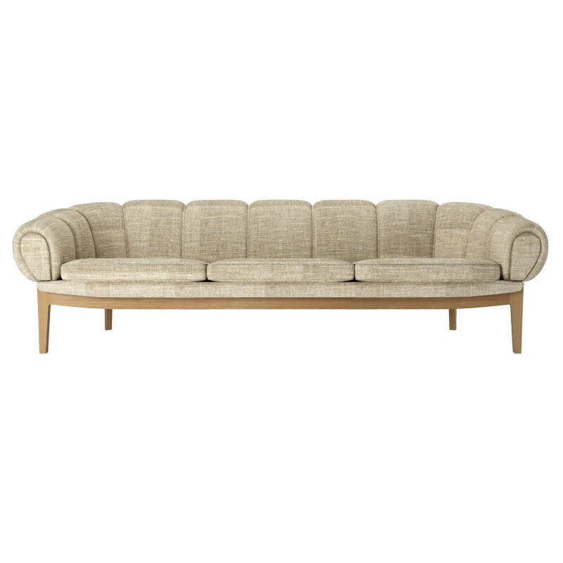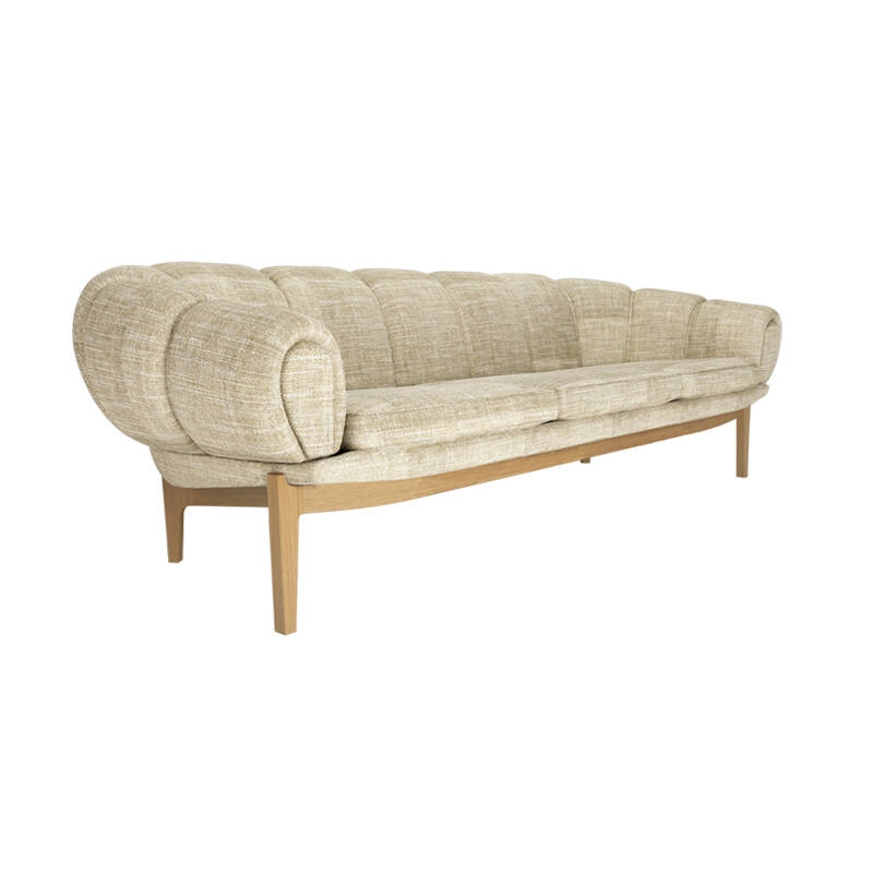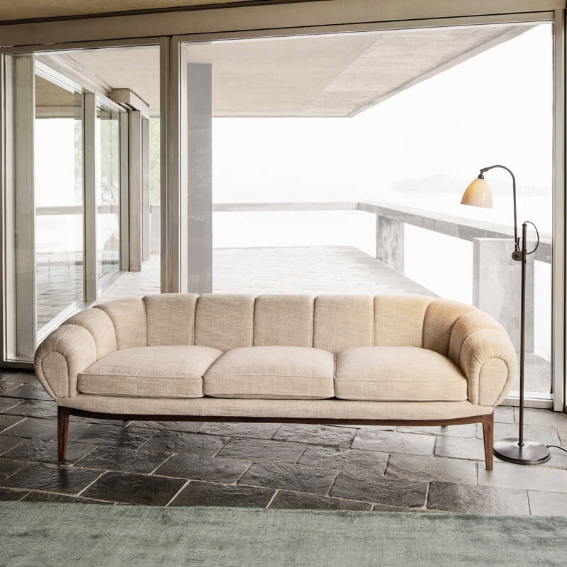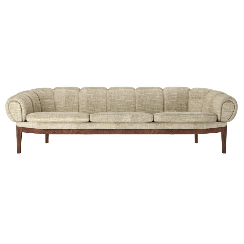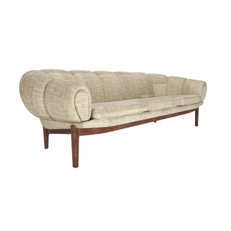 Dessinée par l’architecte et designer danois Illum Wikkelsø en 1962, la collection Croissant est une version élégante et ludique des traditionnels canapés et fauteuils Chesterfield. Pour Wikkelsø, un fauteuil ne doit pas uniquement servir à s’assoir droit, mais doit aussi être confortable quel que soit la position adoptée. Ainsi, il revisite ces pièces classiques pour un public plus détendu qui émerge dans l’optimisme des années 60. Avec sa forme caractéristique et gourmande de viennoiserie, le canapé Croissant se démarque avec un certain sens de l’humour dans tous les intérieurs. Il apporte sa personnalité à lui tout seul de votre salon, mais peut aussi très bien être associé à d’autres meubles au caractère fort. Gubi réédite cette magnifique pièce et rend hommage au design original, en respectant sa présence sculpturale et théâtrale, ses courbes organiques et une fabrication artisanale.