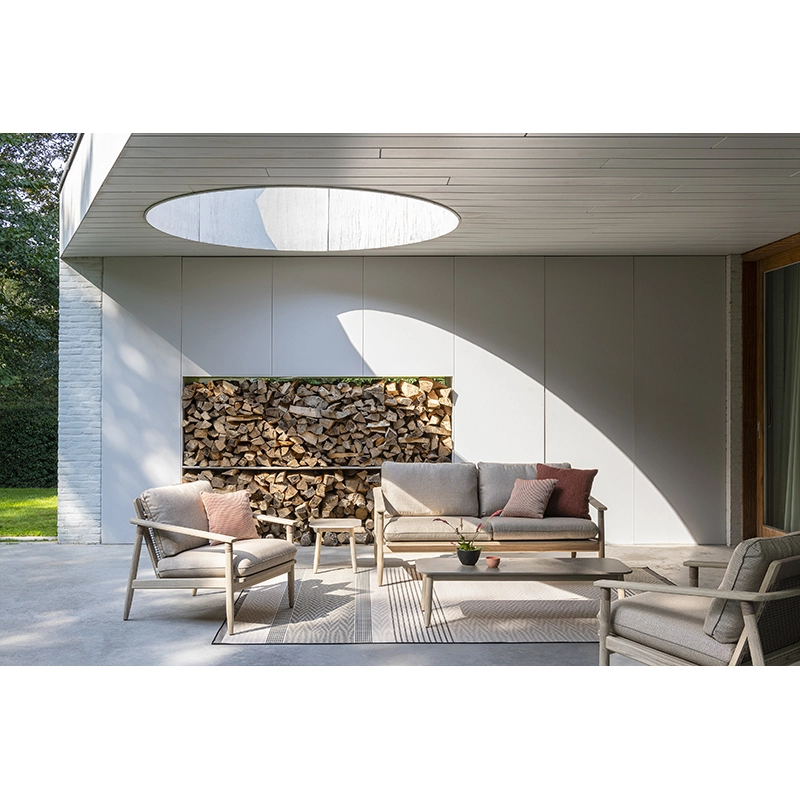 teck teinté brossé, corde en polypropylène greige, coussins mousse quick dry, fibre de polyester, tissu savane coconut s2222, passepoil london stone s0808