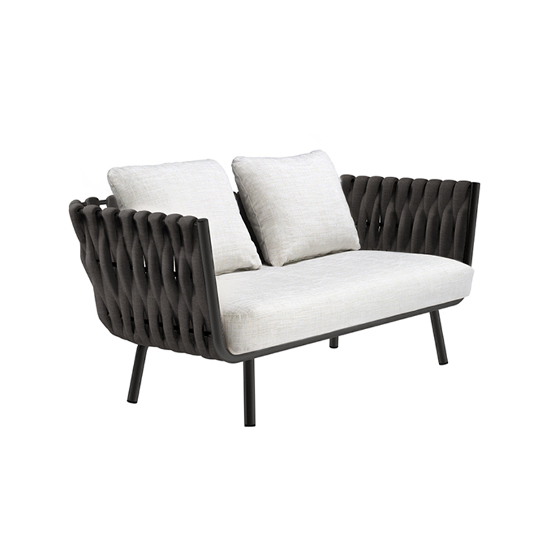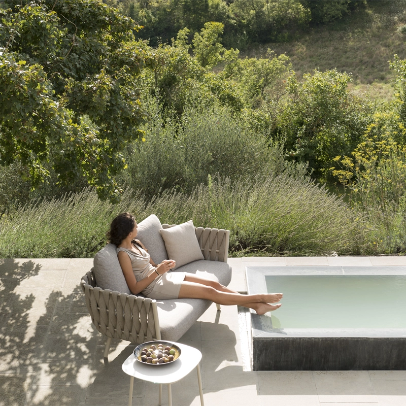 La collection de meubles d'extérieur Tosca de la marque Tribu est à la fois accueillante et chaleureuse, chic et intrigante. C'est la première fois que Tribu fait appel à Monica Armani, qui a conçu cette luxueuse collection chargée d’émotion et de féminité, combinant des assises au tressage vertical extra large soutenues par des pieds effilés légèrement convergents. Les matériaux utilisés pour la création du canapé Tosca 2 places le tressage du dossier est sans aucun doute innovant : une mousse  recouverte d'une gaine tricotée non seulement résistante aux intempéries, mais qui est aussi extrêmement douce au toucher avec un aspect totalement naturel. Le canapé Tosca 2 places, avec ses formes ultra-généreuses, est le cadre idéal pour lézarder et rêver au soleil. Le confort d'assise est très moelleux, grâce aux confortables coussins avec un rembourrage spécifiquement conçu pour l'extérieur.