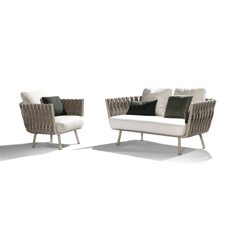 dossier en tricord tressé, pieds en acier inox poudré, assise en batyline, coussins tissu sunbrella